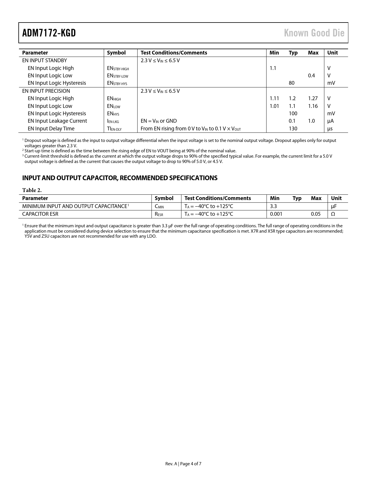 Seiten / Seite7 / 4 — ADM7172-KGD. Known Good Die. Parameter. Symbol. Test Conditions/Comments. …