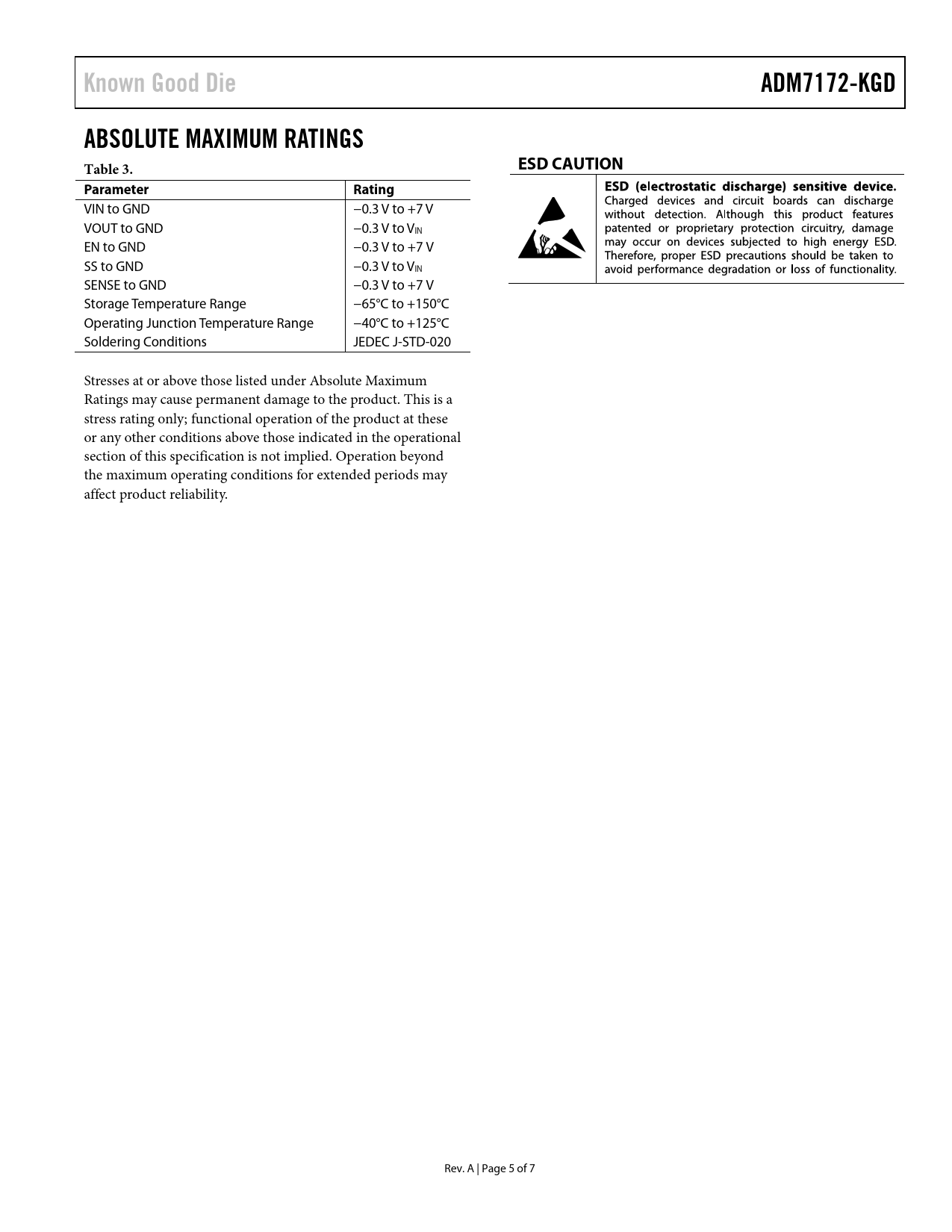 Known Good Die ADM7172-KGD ABSOLUTE MAXIMUM RATINGS Table 3. ESD CAUTION Parameter Rating