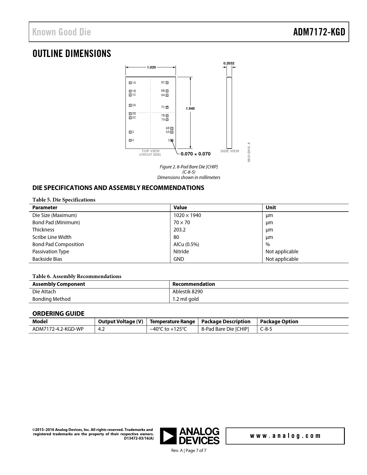 Known Good Die. ADM7172-KGD. OUTLINE DIMENSIONS. 0.2032. 1.020. 1.940. TOP VIEW. SIDE VIEW. 2015-. (CIRCUIT SIDE). 0.070 × 0.070. 21-. 08-