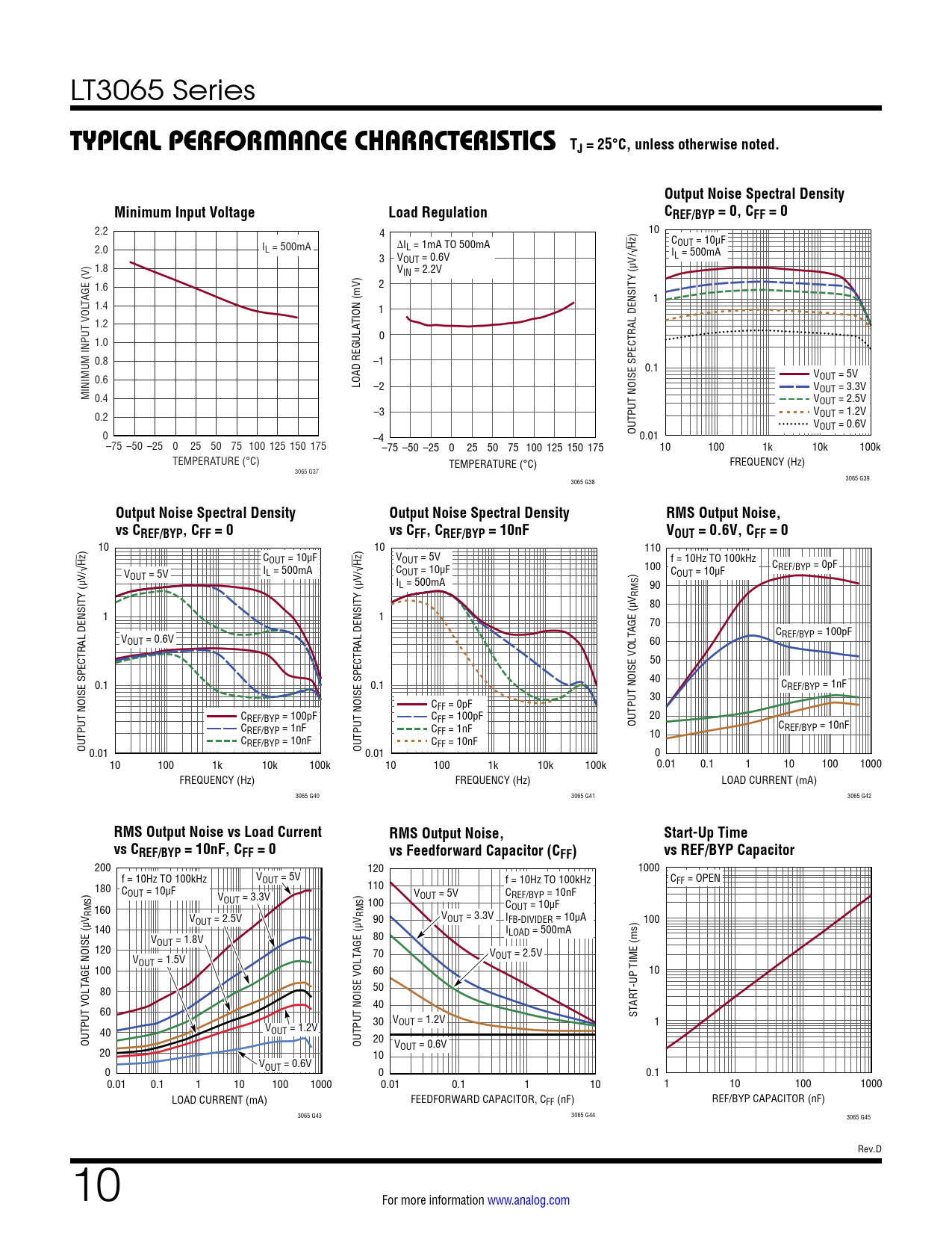 ) 10 ) 10 110 Hz COUT = 10µF Hz VOUT = 5V f = 10Hz TO 100kHz 100 C V I C REF/BYP = 0pF C OUT = 5V L = 500mA OUT = 10µF ) OUT = 10µF IL = 500mA 90 RMS 80 1 1 70 C V REF/BYP = 100pF OUT = 0.6V 60 50 40 0.1 0.1 CREF/BYP = 1nF 30 CFF = 0pF CREF/BYP = 100pF CFF = 100pF 20 C OUTPUT NOISE VOLTAGE (µV C REF/BYP = 1nF CFF = 1nF REF/BYP = 10nF C 10 C OUTPUT NOISE SPECTRAL DENSITY (µV/√ REF/BYP = 10nF FF = 10nF 0.01 OUTPUT NOISE SPECTRAL DENSITY (µV/√ 0.01 0 10 100 1k 10k 100k 10 100 1k 10k 100k 0.01 0.1 1 10 100 1000 FREQUENCY (Hz) FREQUENCY (Hz) LOAD CURRENT (mA) 3065 G40 3065 G41 3065 G42