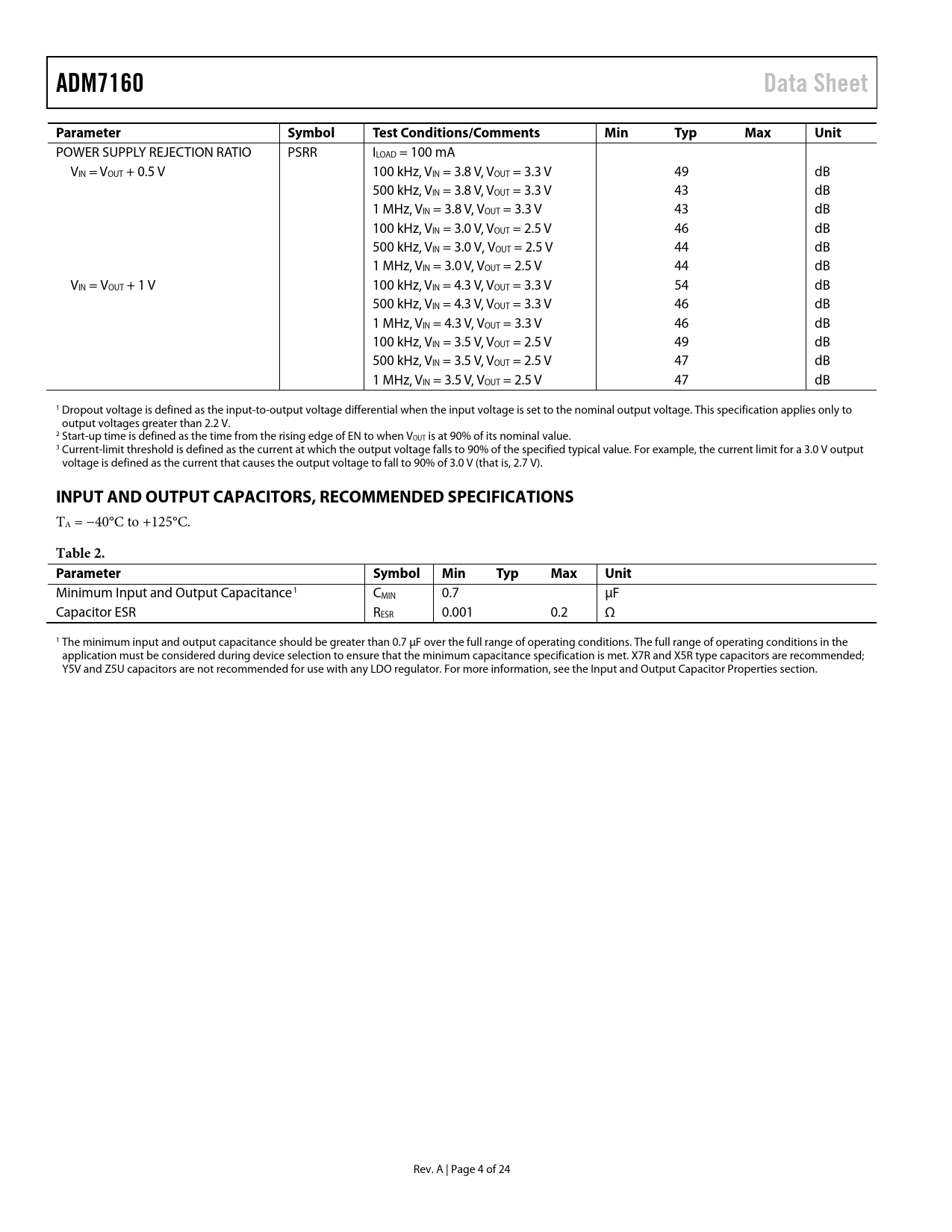 Seiten / Seite24 / 4 — ADM7160. Data Sheet. Parameter. Symbol. Test Conditions/Comments. Min. …