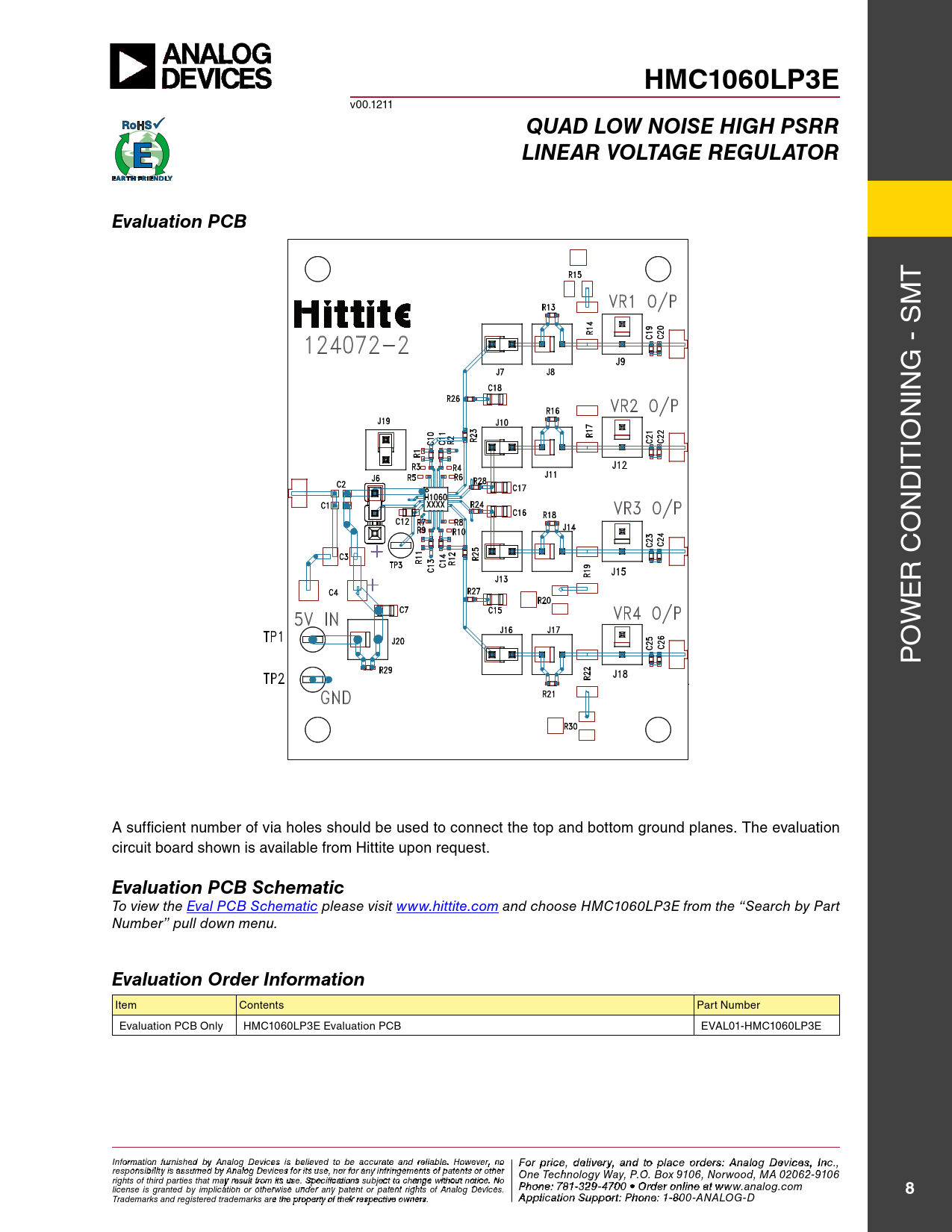 HMC1060LP3E v00.1211 QUAD LOW NOISE HIGH PSRRLINEAR VOLTAGE REGULATOREvaluation PCB t M g - S in n io it d n o r C e w o P A sufficient number of via holes should be used to connect the top and bottom ground planes. the evaluation circuit board shown is available from Hittite upon request. Evaluation PCB Schematic To view the Eval PCB Schematic please visit www.hittite.com and choose HMC1060LP3E from the “Search by Part Number” pull down menu. Evaluation Order Information item Contents Part number evaluation PCB only HMC1060LP3e evaluation PCB eVAL01-HMC1060LP3e Inf F or o m r p atio r n ifc ur e n , d ishe e d lbiv y e A r n y a alog n D d t evic o p es is la beclie o eved rd to ebre sa: H ccur iattti e tae M nd re ilicarbloew . H a o ve C wever, o n rp o For price, delivery, and to place orders: Analog Devices, Inc., responsibility is assumed by Analog Devices for its use, nor for any infringements of patents or other oration, 2 Elizabeth Drive, Chelmsford, MA 01824 One Technology Way, P.O. Box 9106, Norwood, MA 02062-9106 Phone: 978-250-3343 Fax: 978-250-3373 O rights of third parties that may result from its use. Specifications subject to change without notice. No P rd ho e ne r O : 7 n 81- -3li 2n 9 e a -47 t w 0 w 0 • O w rd .h e it r o tniltie n .c e ao t m license is granted by implication or otherwise under any patent or patent rights of Analog Devices. www.analog.com 8 Application Support: Pho Trademarks and registered trademarks are the property of their respective owners. ne: 978-250-33 A 4 p 3 o plica r a tio p n S p u s p @ po h rt itt : P ite ho . n c e o : 1m -800-ANALOG-D