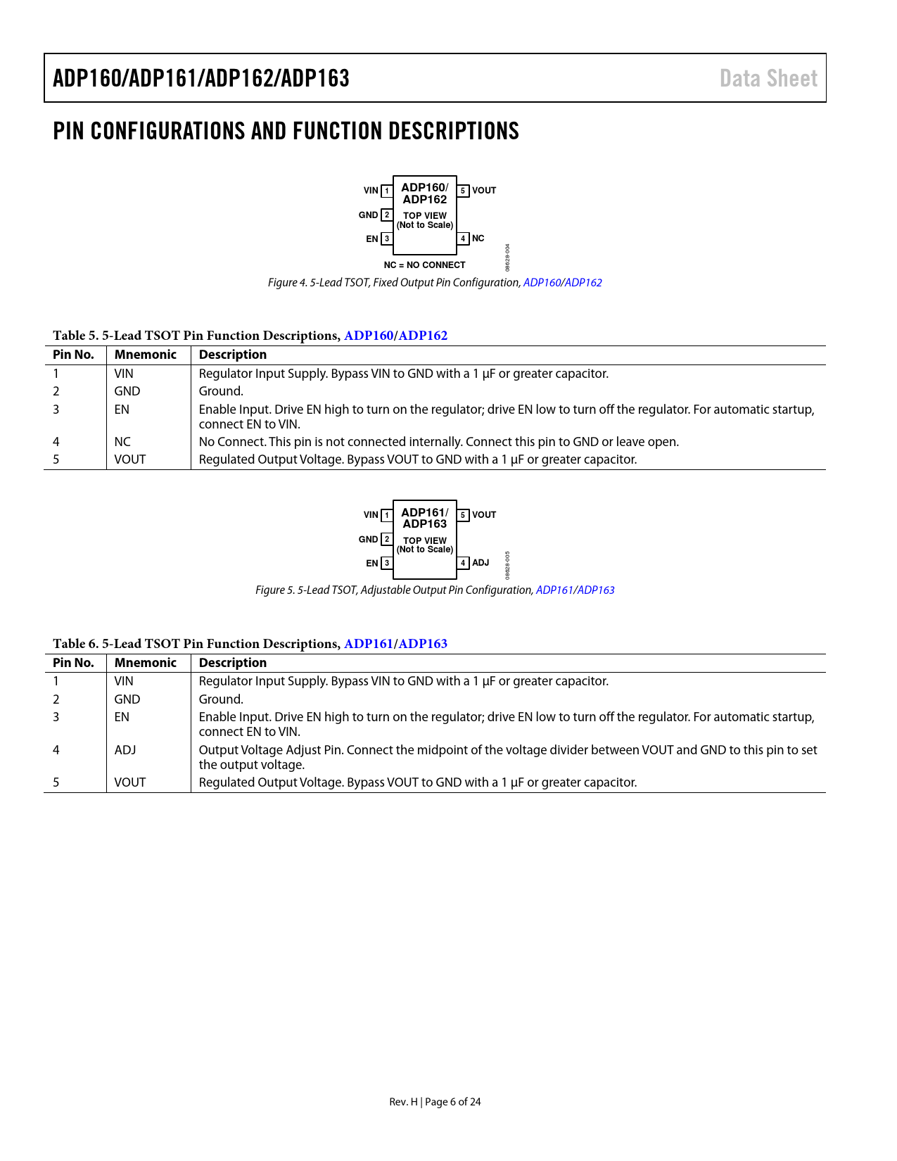 Seiten / Seite24 / 6 — ADP160/ADP161/ADP162/ADP163. Data Sheet. PIN CONFIGURATIONS AND FUNCTION …