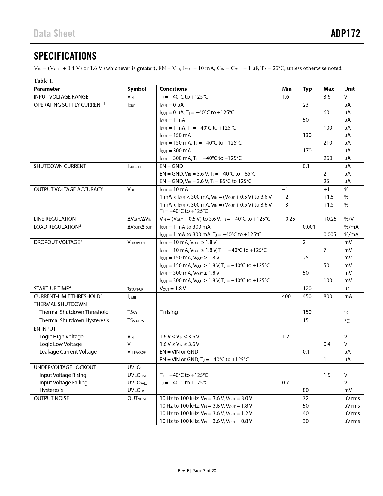 Data Sheet. ADP172. SPECIFICATIONS. Table 1. Parameter. Symbol. Conditions. Min. Typ. Max. Unit