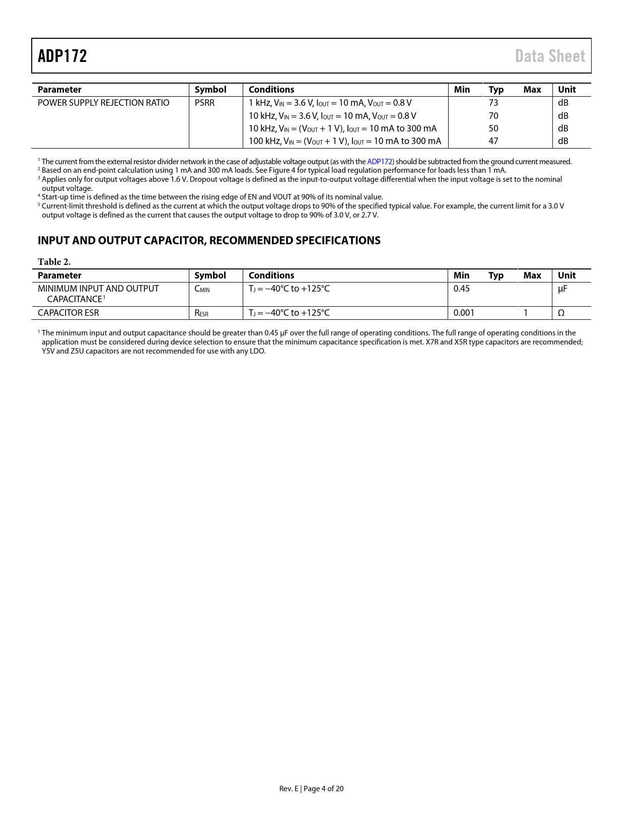 POWER SUPPLY REJECTION RATIO PSRR 1 kHz, VIN = 3.6 V, IOUT = 10 mA, VOUT = 0.8 V 73 dB 10 kHz, VIN = 3.6 V, IOUT = 10 mA, VOUT = 0.8 V 70 dB 10 kHz, VIN = (VOUT + 1 V), IOUT = 10 mA to 300 mA 50 dB 100 kHz, VIN = (VOUT + 1 V), IOUT = 10 mA to 300 mA 47 dB 1 The current from the external resistor divider network in the case of adjustable voltage output (as with the ADP172) should be subtracted from the ground current measured. 2 Based on an end-point calculation using 1 mA and 300 mA loads. See Figure 4 for typical load regulation performance for loads less than 1 mA. 3 Applies only for output voltages above 1.6 V. Dropout voltage is defined as the input-to-output voltage differential when the input voltage is set to the nominal output voltage. 4 Start-up time is defined as the time between the rising edge of EN and VOUT at 90% of its nominal value. 5 Current-limit threshold is defined as the current at which the output voltage drops to 90% of the specified typical value. For example, the current limit for a 3.0 V output voltage is defined as the current that causes the output voltage to drop to 90% of 3.0 V, or 2.7 V.