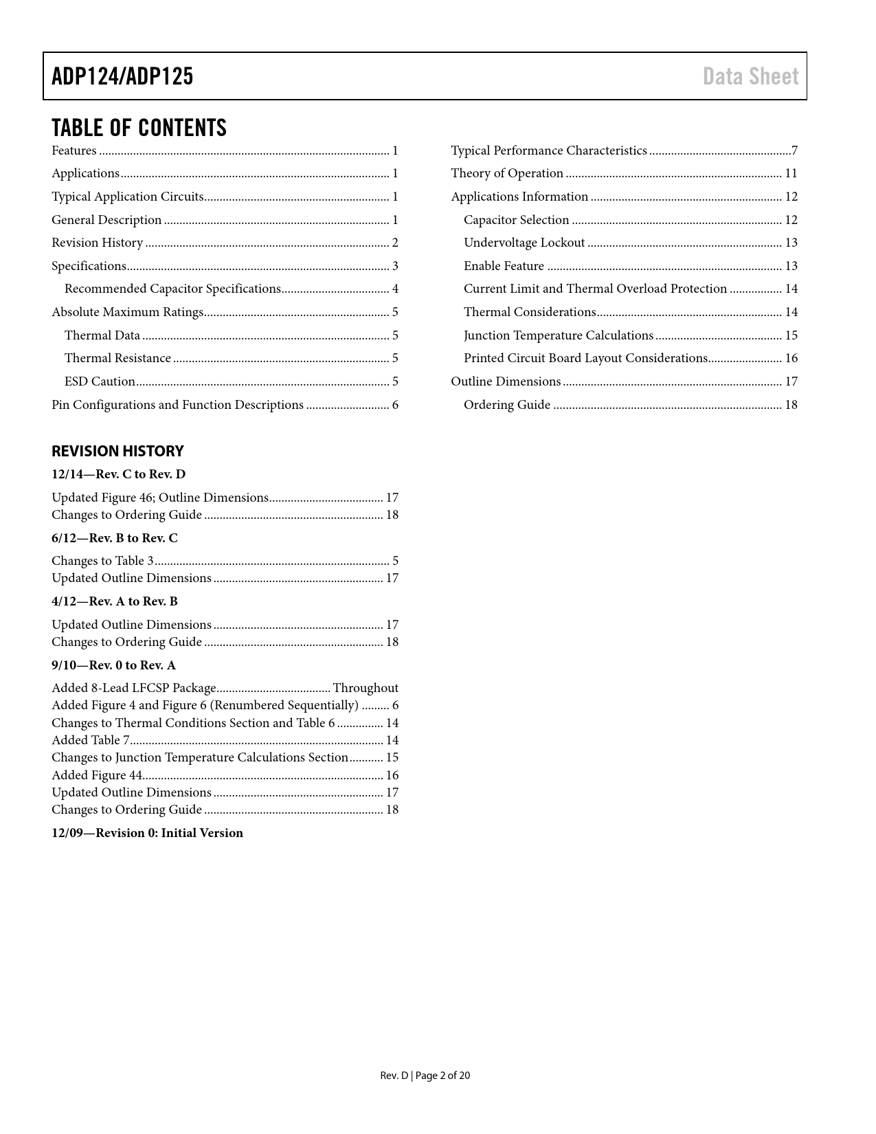 link to page 1 link to page 1 link to page 1 link to page 1 link to page 2 link to page 3 link to page 4 link to page 5 link to page 5 link to page 5 link to page 5 link to page 6 link to page 7 link to page 11 link to page 12 link to page 12 link to page 13 link to page 13 link to page 14 link to page 15 link to page 16 link to page 17 link to page 18 link to page 14 ADP124/ADP125Data SheetTABLE OF CONTENTS Features .. 1 Typical Performance Characteristics ..7 Applications ... 1 Theory of Operation .. 11 Typical Application Circuits .. 1 Applications Information .. 12 General Description ... 1 Capacitor Selection .. 12 Revision History ... 2 Undervoltage Lockout ... 13 Specifications ... 3 Enable Feature .. 13 Recommended Capacitor Specifications ... 4 Current Limit and Thermal Overload Protection ... 14 Absolute Maximum Ratings .. 5 Thermal Considerations .. 14 Thermal Data .. 5 Junction Temperature Calculations ... 15 Thermal Resistance .. 5 Printed Circuit Board Layout Considerations.. 16 ESD Caution .. 5 Outline Dimensions ... 17 Pin Configurations and Function Descriptions ... 6 Ordering Guide .. 18 REVISION HISTORY 12/14—Rev. C to Rev. D Updated Figure 46; Outline Dimensions ... 17 Changes to Ordering Guide .. 18 6/12—Rev. B to Rev. C Changes to Table 3 .. 5 Updated Outline Dimensions ... 17 4/12—Rev. A to Rev. B Updated Outline Dimensions ... 17 Changes to Ordering Guide .. 18 9/10—Rev. 0 to Rev. A Added 8-Lead LFCSP Package ... Throughout Added Figure 4 and Figure 6 (Renumbered Sequentially) ... 6 Changes to Thermal Conditions Section and Table 6 ... 14 Added Table 7 .. 14 Changes to Junction Temperature Calculations Section ... 15 Added Figure 44 .. 16 Updated Outline Dimensions ... 17 Changes to Ordering Guide .. 18 12/09—Revision 0: Initial Version Rev. D | Page 2 of 20 Document Outline FEATURES APPLICATIONS TYPICAL APPLICATION CIRCUITS GENERAL DESCRIPTION TABLE OF CONTENTS REVISION HISTORY SPECIFICATIONS RECOMMENDED CAPACITOR SPECIFICATIONS ABSOLUTE MAXIMUM RATINGS THERMAL DATA THERMAL RESISTANCE ESD CAUTION PIN CONFIGURATIONS AND FUNCTION DESCRIPTIONS TYPICAL PERFORMANCE CHARACTERISTICS THEORY OF OPERATION APPLICATIONS INFORMATION CAPACITOR SELECTION Output Capacitor Input Bypass Capacitor Input and Output Capacitor Properties UNDERVOLTAGE LOCKOUT ENABLE FEATURE CURRENT LIMIT AND THERMAL OVERLOAD PROTECTION THERMAL CONSIDERATIONS JUNCTION TEMPERATURE CALCULATIONS PRINTED CIRCUIT BOARD LAYOUT CONSIDERATIONS OUTLINE DIMENSIONS ORDERING GUIDE