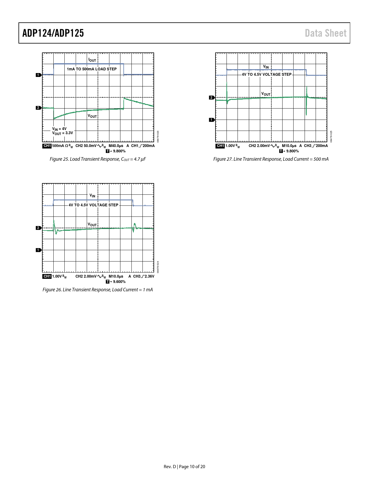 ADP124/ADP125. Data Sheet. IOUT. 1mA TO 500mA LOAD STEP. 4V TO 4.5V VOLTAGE STEP. VOUT. VIN = 4V VOUT = 3.3V. CH1 500mA Ω B. CH2 50.0mV