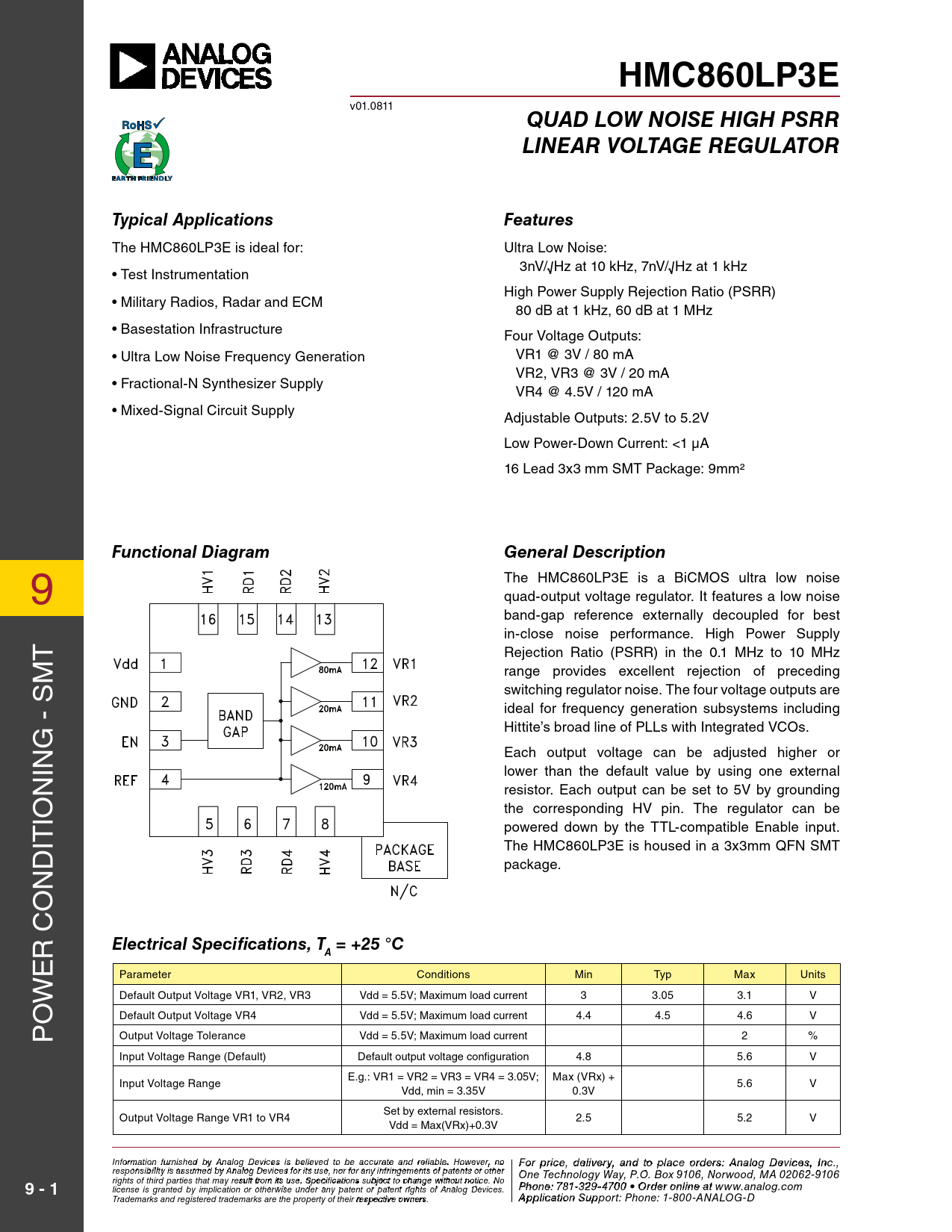 HMC860LP3E v01.0811 QUAD LOW NOISE HIGH PSRRLINEAR VOLTAGE REGULATORTypical ApplicationsFeatures The HMC860LP3E is ideal for: Ultra Low Noise: 3nV/√Hz at 10 kHz, 7nV/√Hz at 1 kHz • Test Instrumentation High Power Supply Rejection Ratio (PSRR) • Military Radios, Radar and ECM 80 dB at 1 kHz, 60 dB at 1 MHz • Basestation Infrastructure Four Voltage Outputs: • Ultra Low Noise Frequency Generation VR1 @ 3V / 80 mA VR2, VR3 @ 3V / 20 mA • Fractional-N Synthesizer Supply VR4 @ 4.5V / 120 mA • Mixed-Signal Circuit Supply Adjustable Outputs: 2.5V to 5.2V Low Power-Down Current: <1 µA 16 Lead 3x3 mm SMT Package: 9mm² Functional DiagramGeneral Description 9 The HMC860LP3E is a BiCMOS ultra low noise quad-output voltage regulator. It features a low noise band-gap reference external y decoupled for best in-close noise performance. High Power Supply T Rejection Ratio (PSRR) in the 0.1 MHz to 10 MHz M range provides excel ent rejection of preceding switching regulator noise. The four voltage outputs are ideal for frequency generation subsystems including G - S Hittite’s broad line of PLLs with Integrated VCOs. IN Each output voltage can be adjusted higher or N lower than the default value by using one external resistor. Each output can be set to 5V by grounding IO the corresponding HV pin. The regulator can be IT powered down by the TTL-compatible Enable input. D The HMC860LP3E is housed in a 3x3mm QFN SMT N package. O R C Electrical Specifications, T = +25 °C E A Parameter Conditions Min Typ Max Units W Default Output Voltage VR1, VR2, VR3 Vdd = 5.5V; Maximum load current 3 3.05 3.1 V O Default Output Voltage VR4 Vdd = 5.5V; Maximum load current 4.4 4.5 4.6 V P Output Voltage Tolerance Vdd = 5.5V; Maximum load current 2 % Input Voltage Range (Default) Default output voltage configuration 4.8 5.6 V E.g.: VR1 = VR2 = VR3 = VR4 = 3.05V; Max (VRx) + Input Voltage Range 5.6 V Vdd, min = 3.35V 0.3V Set by external resistors. Output Voltage Range VR1 to VR4 2.5 5.2 V Vdd = Max(VRx)+0.3V Inf F or o m ra tip o r n ifc ur e n ,is hd e e d lbiv y e A r n y al oa g n D d evi tco e s p is la beclie ev eo d rtd o ebre sa: H ccur iattti e taen M d re ilicarbloew . H a o ve wev eC r, o n r o For price, delivery, and to place orders: Analog Devices, Inc., responsibility is assumed by Analog Devices for its use, nor for any infringements of patents or other poration, 2 Elizabeth Drive, Chelmsford, MA 01824 One Technology Way, P.O. Box 9106, Norwood, MA 02062-9106 9 - 1 978-250-3343 tel • 978-250-3373 fax • O rights of third parties that may result from its use. Specifications subject to change without notice. No rd P e h r o nO e n : 7 -li 81 n - e 32 a 9- t 4 w 70 ww. 0 • Ohi rd tt e ite r on.lc inom license is granted by implication or otherwise under any patent or patent rights of Analog Devices. e at www.analog.com Application Trademarks and registered trademarks are the property of their respective owners.Support: apps@ A h ppitlitcitae ti .oco n Sm upport: Phone: 1-800-ANALOG-D