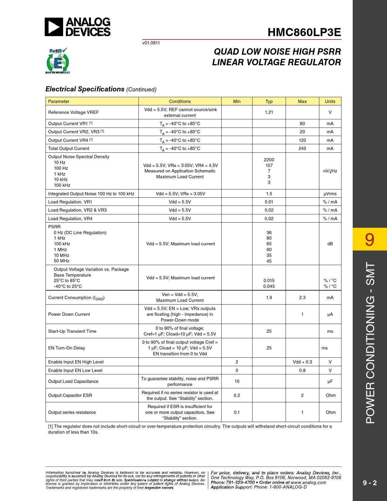 HMC860LP3E. QUAD LOW NOISE HIGH PSRR. LINEAR VOLTAGE REGULATOR. Electrical Specifications. 9 - 2