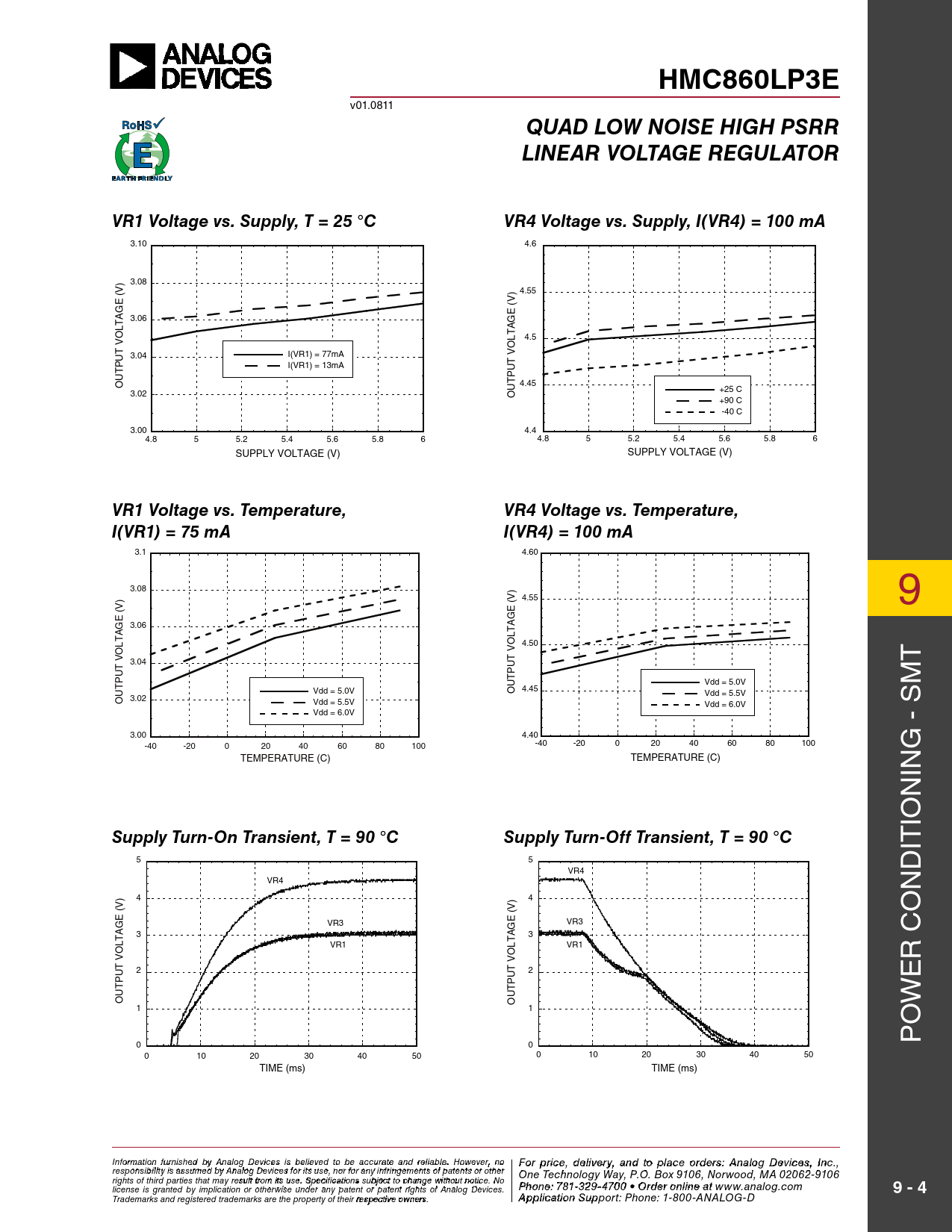 HMC860LP3E v01.0811 QUAD LOW NOISE HIGH PSRRLINEAR VOLTAGE REGULATORVR1 Voltage vs. Supply, T = 25 °CVR4 Voltage vs. Supply, I(VR4) = 100 mA 3.10 4.6 ) 3.08 (V 4.55 ) E G (V A E 3.06 G LT A O LT 4.5 V O T 3.04 I(VR1) = 77mA U V P T I(VR1) = 13mA T U U P O T 4.45 U 3.02 +25 C O +90 C -40 C 3.00 4.4 4.8 5 5.2 5.4 5.6 5.8 6 4.8 5 5.2 5.4 5.6 5.8 6 SUPPLY VOLTAGE (V) SUPPLY VOLTAGE (V) VR1 Voltage vs. Temperature,VR4 Voltage vs. Temperature,I(VR1) = 75 mAI(VR4) = 100 mA 3.1 4.60 3.08 ) 4.55 (V E 9 (V E G G 3.06 A A LT LT O 4.50 O V V T 3.04 U T T U P P T T U Vdd = 5.0V M Vdd = 5.0V U 4.45 O Vdd = 5.5V 3.02 O Vdd = 5.5V Vdd = 6.0V Vdd = 6.0V 3.00 4.40 -40 -20 0 20 40 60 80 100 -40 -20 0 20 40 60 80 100 G - S TEMPERATURE (C) TEMPERATURE (C) IN N IO Supply Turn-On Transient, T = 90 °CSupply Turn-Off Transient, T = 90 °C IT 5 5 VR4 D VR4 N ) 4 4 ) (V (V O E E G VR3 VR3 A G 3 A 3 LT LT O VR1 VR1 O V V R C T 2 T U 2 P U E T P T U U O O W 1 1 O 0 0 P 0 10 20 30 40 50 0 10 20 30 40 50 TIME (ms) TIME (ms) Inf F or o m ra tip o r n ifc ur e n ,is hd e e d lbiv y e A r n y al oa g n D d evi tco e s p is la beclie ev eo d rtd o ebre sa: H ccur iattti e taen M d re ilicarbloew . H a o ve wev eC r, o n r o For price, delivery, and to place orders: Analog Devices, Inc., responsibility is assumed by Analog Devices for its use, nor for any infringements of patents or other poration, 2 Elizabeth Drive, Chelmsford, MA 01824 One Technology Way, P.O. Box 9106, Norwood, MA 02062-9106 978-250-3343 tel • 978-250-3373 fax • O rights of third parties that may result from its use. Specifications subject to change without notice. No rd P e h r o nO e n : 7 -li 81 n - e 32 a 9- t 4 w 70 ww. 0 • Ohi rd tt e ite r on.lc inom license is granted by implication or otherwise under any patent or patent rights of Analog Devices. e at www.analog.com 9 - 4 Application Trademarks and registered trademarks are the property of their respective owners.Support: apps@ A h ppitlitcitae ti .oco n Sm upport: Phone: 1-800-ANALOG-D