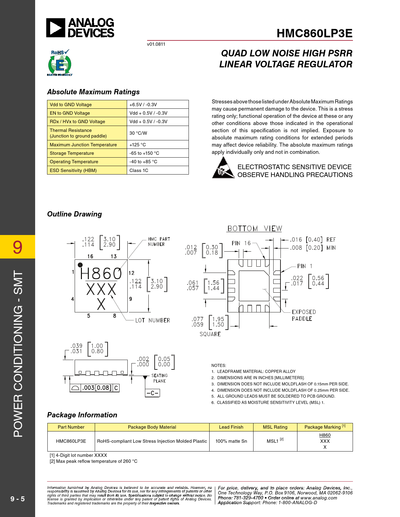 HMC860LP3E. QUAD LOW NOISE HIGH PSRR. LINEAR VOLTAGE REGULATOR. Absolute Maximum Ratings. Outline Drawing. Package Information