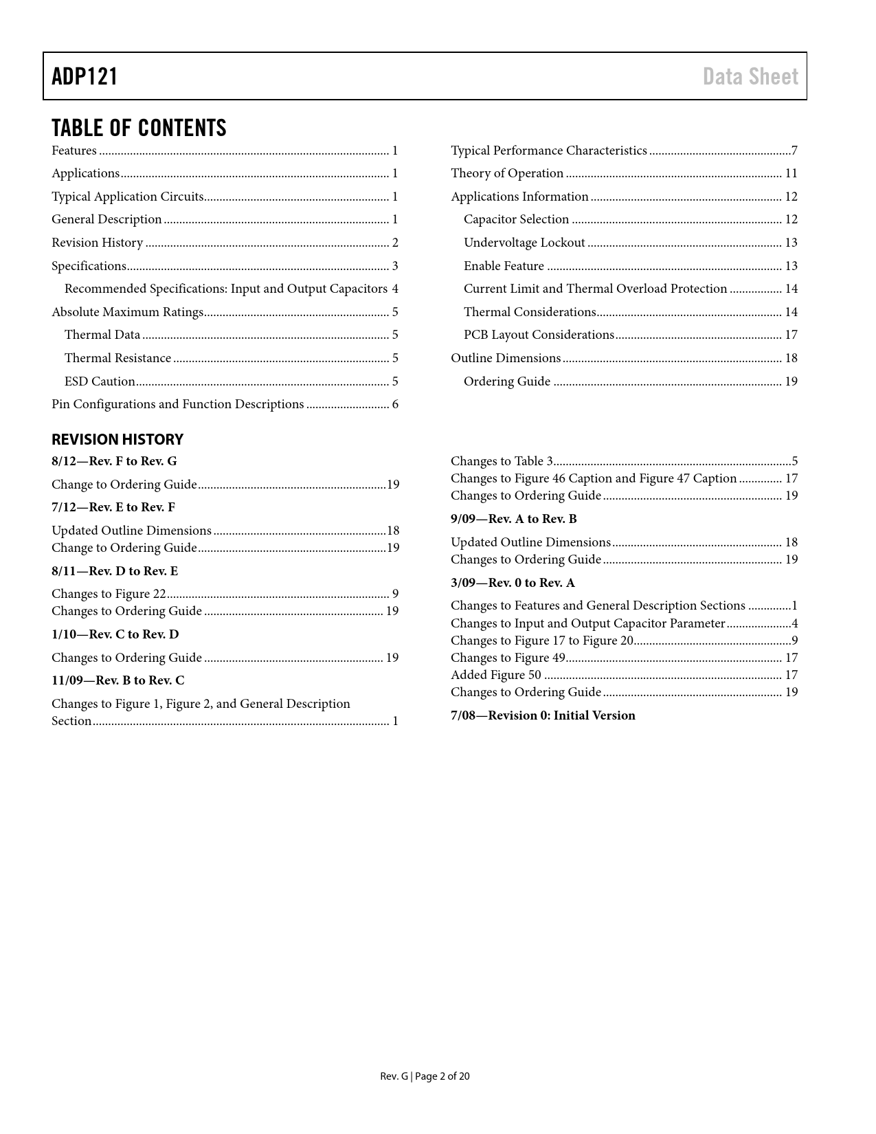 link to page 1 link to page 1 link to page 1 link to page 1 link to page 2 link to page 4 link to page 5 link to page 5 link to page 5 link to page 5 link to page 6 link to page 7 link to page 11 link to page 12 link to page 12 link to page 13 link to page 13 link to page 14 link to page 14 link to page 17 link to page 18 link to page 19 link to page 3 ADP121Data SheetTABLE OF CONTENTS Features .. 1 Typical Performance Characteristics ..7 Applications ... 1 Theory of Operation .. 11 Typical Application Circuits .. 1 Applications Information .. 12 General Description ... 1 Capacitor Selection .. 12 Revision History ... 2 Undervoltage Lockout ... 13 Specifications ... 3 Enable Feature .. 13 Recommended Specifications: Input and Output Capacitors 4 Current Limit and Thermal Overload Protection ... 14 Absolute Maximum Ratings .. 5 Thermal Considerations .. 14 Thermal Data .. 5 PCB Layout Considerations .. 17 Thermal Resistance .. 5 Outline Dimensions ... 18 ESD Caution .. 5 Ordering Guide .. 19 Pin Configurations and Function Descriptions ... 6 REVISION HISTORY8/12—Rev. F to Rev. G Changes to Table 3 ... 5 Change to Ordering Guide ... 19 Changes to Figure 46 Caption and Figure 47 Caption .. 17 Changes to Ordering Guide .. 19 7/12—Rev. E to Rev. F9/09—Rev. A to Rev. B Updated Outline Dimensions .. 18 Change to Ordering Guide ... 19 Updated Outline Dimensions ... 18 Changes to Ordering Guide .. 19 8/11—Rev. D to Rev. E3/09—Rev. 0 to Rev. A Changes to Figure 22 .. 9 Changes to Ordering Guide .. 19 Changes to Features and General Description Sections .. 1 Changes to Input and Output Capacitor Parameter ... 4 1/10—Rev. C to Rev. D Changes to Figure 17 to Figure 20 ... 9 Changes to Ordering Guide .. 19 Changes to Figure 49 .. 17 11/09—Rev. B to Rev. C Added Figure 50 ... 17 Changes to Ordering Guide .. 19 Changes to Figure 1, Figure 2, and General Description Section .. 1 7/08—Revision 0: Initial Version Rev. G | Page 2 of 20 Document Outline Features Applications Typical Application Circuits General Description Revision History Specifications Recommended Specifications: Input and Output Capacitors Absolute Maximum Ratings Thermal Data Thermal Resistance ESD Caution Pin Configurations and Function Descriptions Typical Performance Characteristics Theory of Operation Applications Information Capacitor Selection Output Capacitor Input Bypass Capacitor Input and Output Capacitor Properties Undervoltage Lockout Enable Feature Current Limit and Thermal Overload Protection Thermal Considerations PCB Layout Considerations Outline Dimensions Ordering Guide