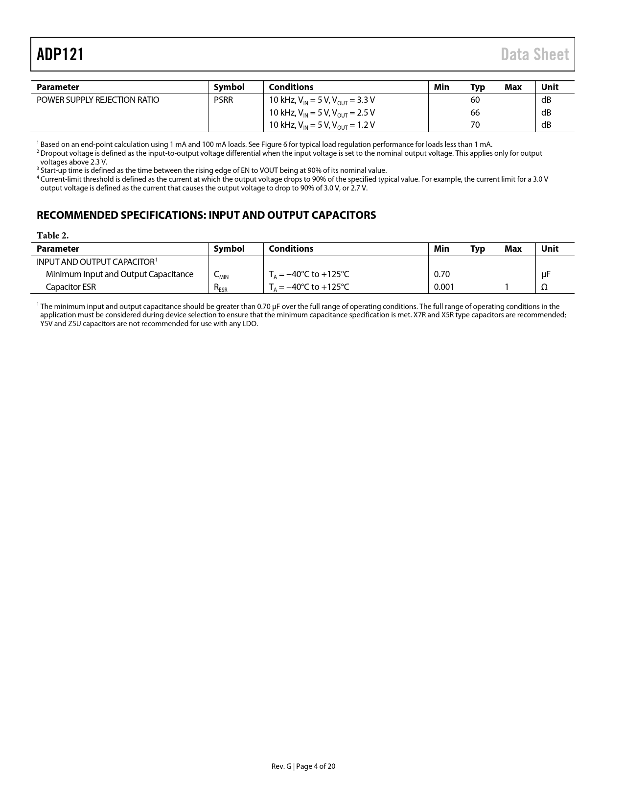ADP121. Data Sheet. Parameter. Symbol. Conditions. Min. Typ. Max. Unit. RECOMMENDED SPECIFICATIONS: INPUT AND OUTPUT CAPACITORS