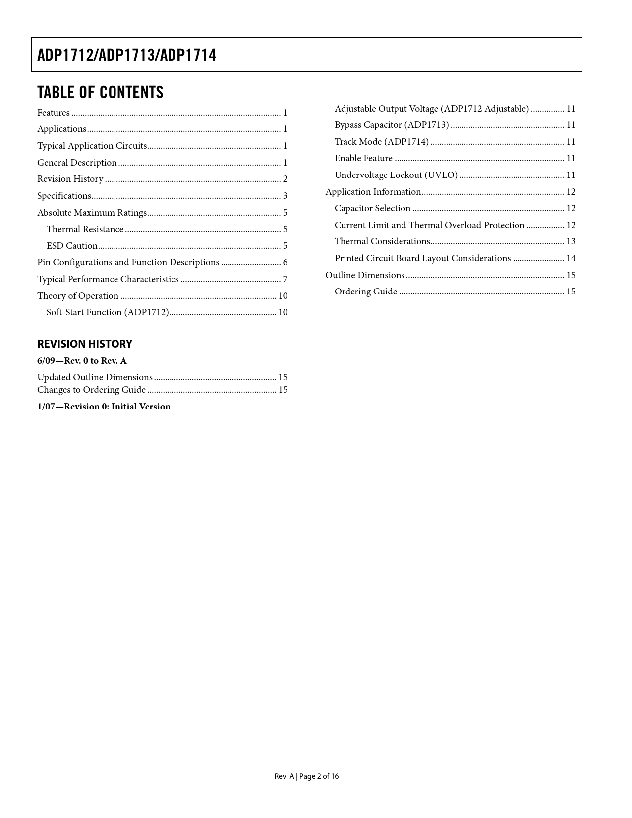 link to page 3 link to page 5 link to page 6 link to page 7 link to page 10 link to page 11 link to page 11 link to page 12 link to page 13 link to page 14 link to page 15 link to page 15 link to page 1 link to page 1 link to page 1 link to page 1 link to page 2 link to page 5 link to page 5 link to page 10 link to page 11 link to page 11 link to page 12 link to page 12 link to page 11 ADP1712/ADP1713/ADP1714TABLE OF CONTENTS Features .. 1 Adjustable Output Voltage (ADP1712 Adjustable) ... 11 Applications ... 1 Bypass Capacitor (ADP1713) ... 11 Typical Application Circuits .. 1 Track Mode (ADP1714) .. 11 General Description ... 1 Enable Feature .. 11 Revision History ... 2 Undervoltage Lockout (UVLO) ... 11 Specifications ... 3 Application Information .. 12 Absolute Maximum Ratings .. 5 Capacitor Selection .. 12 Thermal Resistance .. 5 Current Limit and Thermal Overload Protection ... 12 ESD Caution .. 5 Thermal Considerations .. 13 Pin Configurations and Function Descriptions ... 6 Printed Circuit Board Layout Considerations ... 14 Typical Performance Characteristics ... 7 Outline Dimensions ... 15 Theory of Operation .. 10 Ordering Guide .. 15 Soft-Start Function (ADP1712) .. 10 REVISION HISTORY6/09—Rev. 0 to Rev. A Updated Outline Dimensions ... 15 Changes to Ordering Guide .. 15 1/07—Revision 0: Initial Version Rev. A | Page 2 of 16 Document Outline FEATURES APPLICATIONS TYPICAL APPLICATION CIRCUITS GENERAL DESCRIPTION TABLE OF CONTENTS REVISION HISTORY SPECIFICATIONS ABSOLUTE MAXIMUM RATINGS THERMAL RESISTANCE ESD CAUTION PIN CONFIGURATIONS AND FUNCTION DESCRIPTIONS TYPICAL PERFORMANCE CHARACTERISTICS THEORY OF OPERATION SOFT-START FUNCTION (ADP1712) ADJUSTABLE OUTPUT VOLTAGE(ADP1712 ADJUSTABLE) BYPASS CAPACITOR (ADP1713) TRACK MODE (ADP1714) ENABLE FEATURE UNDERVOLTAGE LOCKOUT (UVLO) APPLICATION INFORMATION CAPACITOR SELECTION Output Capacitor Input Bypass Capacitor Input and Output Capacitor Properties CURRENT LIMIT AND THERMAL OVERLOAD PROTECTION THERMAL CONSIDERATIONS PRINTED CIRCUIT BOARD LAYOUT CONSIDERATIONS OUTLINE DIMENSIONS ORDERING GUIDE