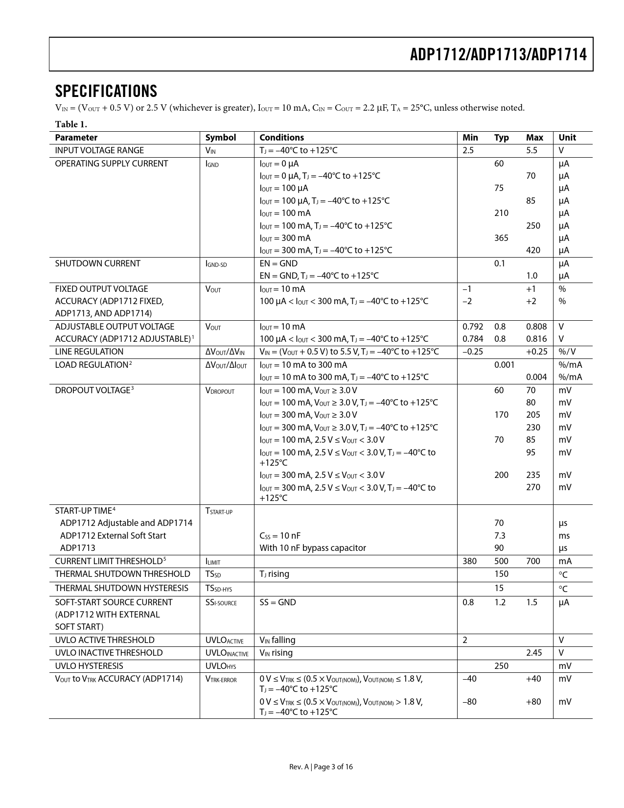 ADP1712/ADP1713/ADP1714. SPECIFICATIONS. Table 1. Parameter. Symbol. Conditions. Min. Typ. Max. Unit