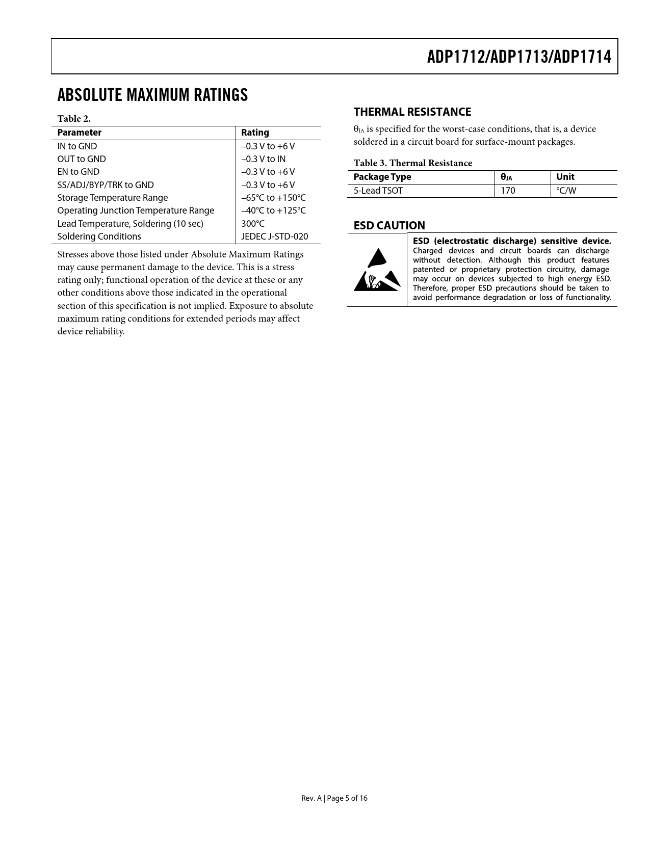 ADP1712/ADP1713/ADP1714ABSOLUTE MAXIMUM RATINGSTHERMAL RESISTANCETable 2. Parameter Rating θJA is specified for the worst-case conditions, that is, a device IN to GND –0.3 V to +6 V soldered in a circuit board for surface-mount packages. OUT to GND –0.3 V to IN Table 3. Thermal Resistance EN to GND –0.3 V to +6 V Package TypeθJA Unit SS/ADJ/BYP/TRK to GND –0.3 V to +6 V 5-Lead TSOT 170 °C/W Storage Temperature Range –65°C to +150°C Operating Junction Temperature Range –40°C to +125°C Lead Temperature, Soldering (10 sec) 300°C ESD CAUTION Soldering Conditions JEDEC J-STD-020 Stresses above those listed under Absolute Maximum Ratings may cause permanent damage to the device. This is a stress rating only; functional operation of the device at these or any other conditions above those indicated in the operational section of this specification is not implied. Exposure to absolute maximum rating conditions for extended periods may affect device reliability. Rev. A | Page 5 of 16 Document Outline FEATURES APPLICATIONS TYPICAL APPLICATION CIRCUITS GENERAL DESCRIPTION TABLE OF CONTENTS REVISION HISTORY SPECIFICATIONS ABSOLUTE MAXIMUM RATINGS THERMAL RESISTANCE ESD CAUTION PIN CONFIGURATIONS AND FUNCTION DESCRIPTIONS TYPICAL PERFORMANCE CHARACTERISTICS THEORY OF OPERATION SOFT-START FUNCTION (ADP1712) ADJUSTABLE OUTPUT VOLTAGE(ADP1712 ADJUSTABLE) BYPASS CAPACITOR (ADP1713) TRACK MODE (ADP1714) ENABLE FEATURE UNDERVOLTAGE LOCKOUT (UVLO) APPLICATION INFORMATION CAPACITOR SELECTION Output Capacitor Input Bypass Capacitor Input and Output Capacitor Properties CURRENT LIMIT AND THERMAL OVERLOAD PROTECTION THERMAL CONSIDERATIONS PRINTED CIRCUIT BOARD LAYOUT CONSIDERATIONS OUTLINE DIMENSIONS ORDERING GUIDE