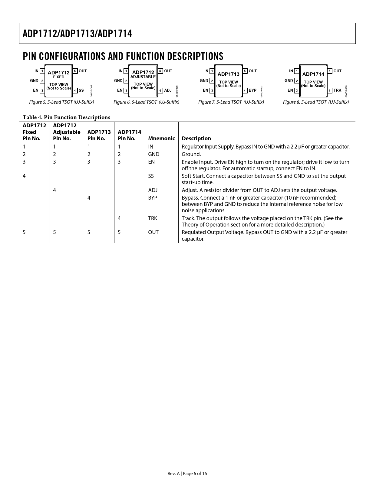 link to page 10 ADP1712/ADP1713/ADP1714PIN CONFIGURATIONS AND FUNCTION DESCRIPTIONSIN 15 OUTADP1712IN 15 OUTADP1712IN 15 OUTIN 15 OUTADP1713ADP1714FIXEDADJUSTABLEGND 2GND 2GND 2TOP VIEWGND 2TOP VIEWTOP VIEWTOP VIEW 5 6 (Not to Scale) 7 (Not to Scale) 8 (Not to Scale) 0 (Not to Scale)EN 0 34 SS 00 00 00 5- EN 34 ADJ 5- EN 34 BYP 5- EN 34 TRK 5- 45 45 45 45 06 06 06 06 Figure 5. 5-Lead TSOT (UJ-Suffix) Figure 6. 5-Lead TSOT (UJ-Suffix) Figure 7. 5-Lead TSOT (UJ-Suffix) Figure 8. 5-Lead TSOT (UJ-Suffix) Table 4. Pin Function Descriptions ADP1712ADP1712FixedAdjustableADP1713ADP1714Pin No.Pin No.Pin No.Pin No.MnemonicDescription 1 1 1 1 IN Regulator Input Supply. Bypass IN to GND with a 2.2 μF or greater capacitor. 2 2 2 2 GND Ground. 3 3 3 3 EN Enable Input. Drive EN high to turn on the regulator; drive it low to turn off the regulator. For automatic startup, connect EN to IN. 4 SS Soft Start. Connect a capacitor between SS and GND to set the output start-up time. 4 ADJ Adjust. A resistor divider from OUT to ADJ sets the output voltage. 4 BYP Bypass. Connect a 1 nF or greater capacitor (10 nF recommended) between BYP and GND to reduce the internal reference noise for low noise applications. 4 TRK Track. The output follows the voltage placed on the TRK pin. (See the Theory of Operation section for a more detailed description.) 5 5 5 5 OUT Regulated Output Voltage. Bypass OUT to GND with a 2.2 μF or greater capacitor. Rev. A | Page 6 of 16 Document Outline FEATURES APPLICATIONS TYPICAL APPLICATION CIRCUITS GENERAL DESCRIPTION TABLE OF CONTENTS REVISION HISTORY SPECIFICATIONS ABSOLUTE MAXIMUM RATINGS THERMAL RESISTANCE ESD CAUTION PIN CONFIGURATIONS AND FUNCTION DESCRIPTIONS TYPICAL PERFORMANCE CHARACTERISTICS THEORY OF OPERATION SOFT-START FUNCTION (ADP1712) ADJUSTABLE OUTPUT VOLTAGE(ADP1712 ADJUSTABLE) BYPASS CAPACITOR (ADP1713) TRACK MODE (ADP1714) ENABLE FEATURE UNDERVOLTAGE LOCKOUT (UVLO) APPLICATION INFORMATION CAPACITOR SELECTION Output Capacitor Input Bypass Capacitor Input and Output Capacitor Properties CURRENT LIMIT AND THERMAL OVERLOAD PROTECTION THERMAL CONSIDERATIONS PRINTED CIRCUIT BOARD LAYOUT CONSIDERATIONS OUTLINE DIMENSIONS ORDERING GUIDE