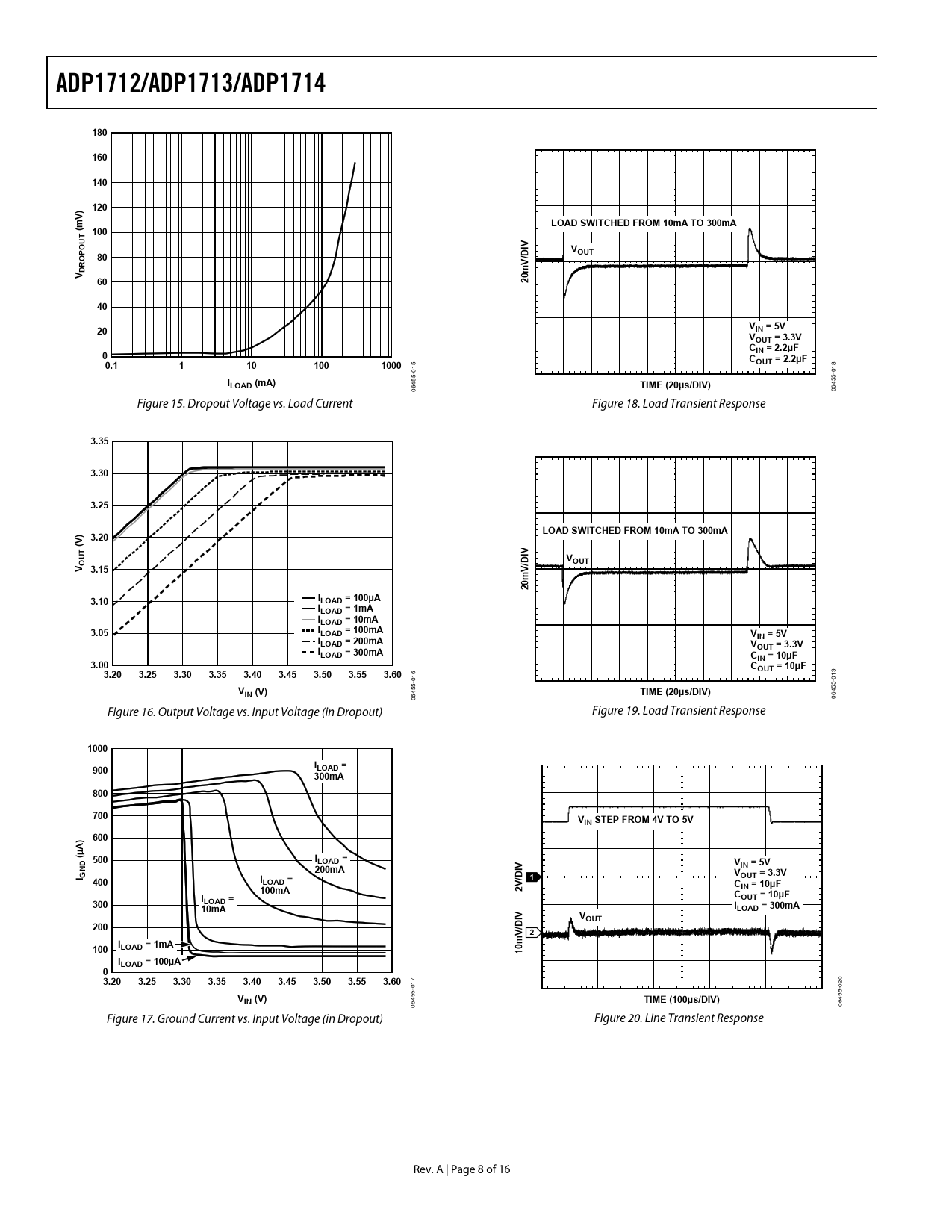 ADP1712/ADP1713/ADP1714. 180. 160. 140. 120. LOAD SWITCHED FROM 10mA TO 300mA. (m T 100. VOUT. DV 60. 20m. IN = 5V. VOUT = 3.3V. CIN = 2.2μF. 0.1