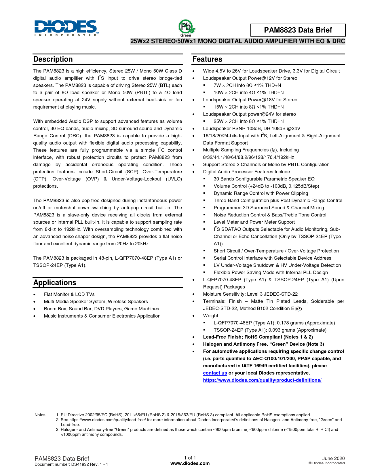 PAM8823 Data Brief. 25Wx2 STEREO/50Wx1 MONO DIGITAL AUDIO AMPLIFIER WITH EQ & DRC. Description. Features. Applications