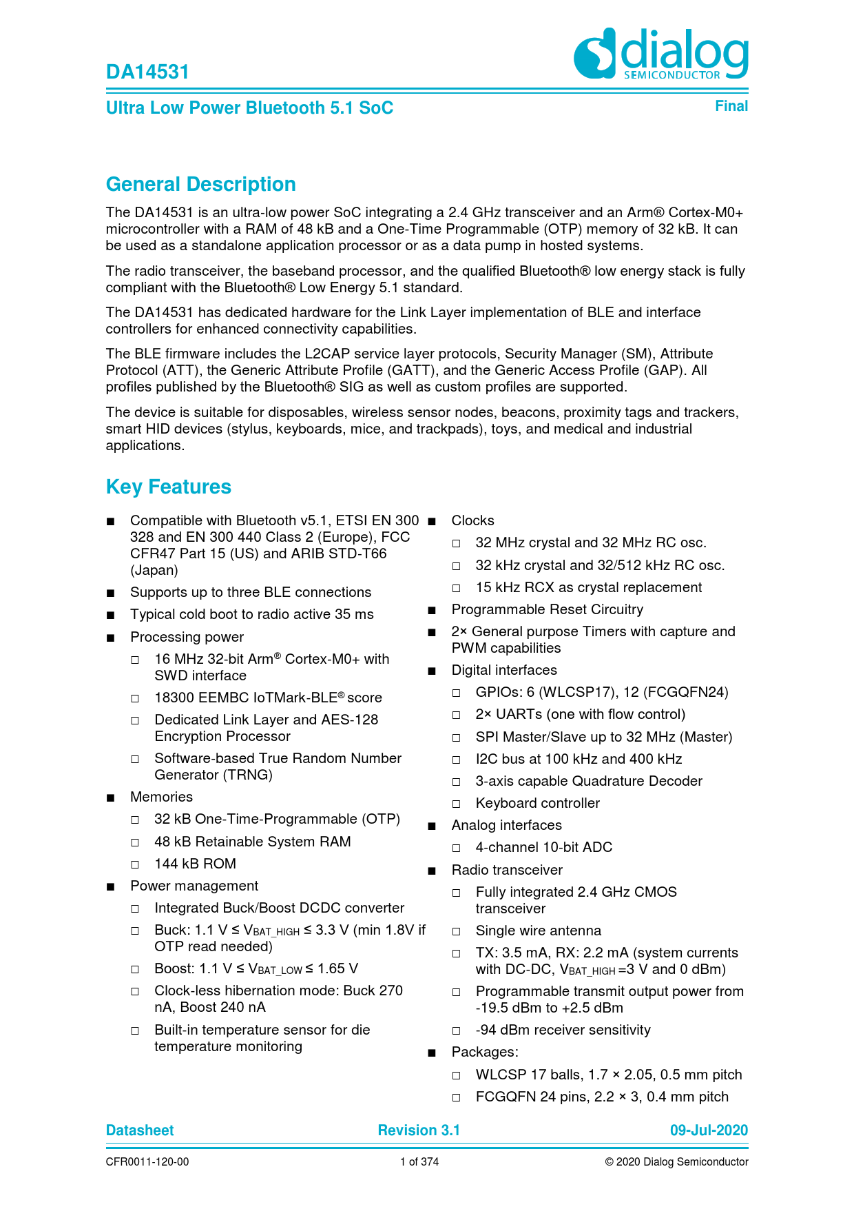 DA14531. Ultra Low Power Bluetooth 5.1 SoC. Final. General Description. Key Features. Datasheet. Revision 3.1. 09-Jul-2020
