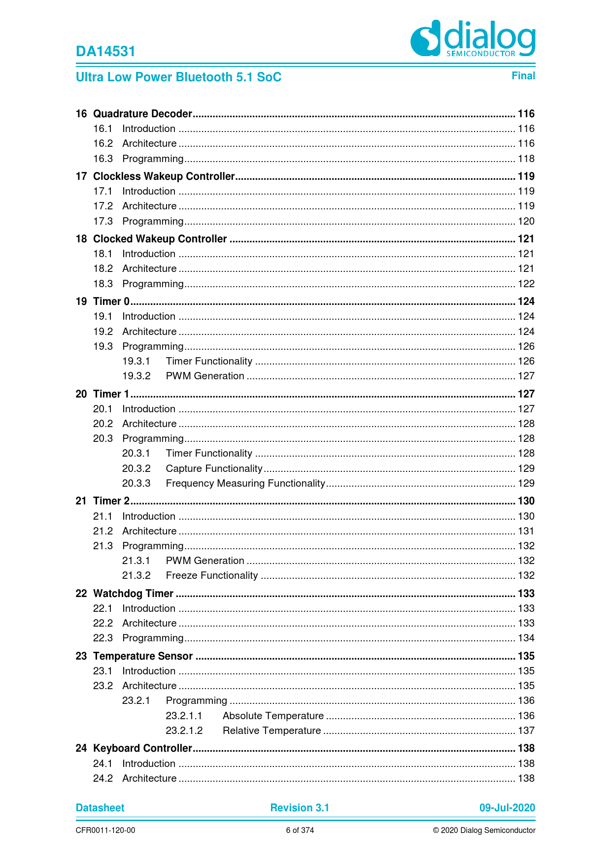 DA14531. Ultra Low Power Bluetooth 5.1 SoC. Final. 16 Quadrature Decoder .. 116. 17 Clockless Wakeup Controller... 119
