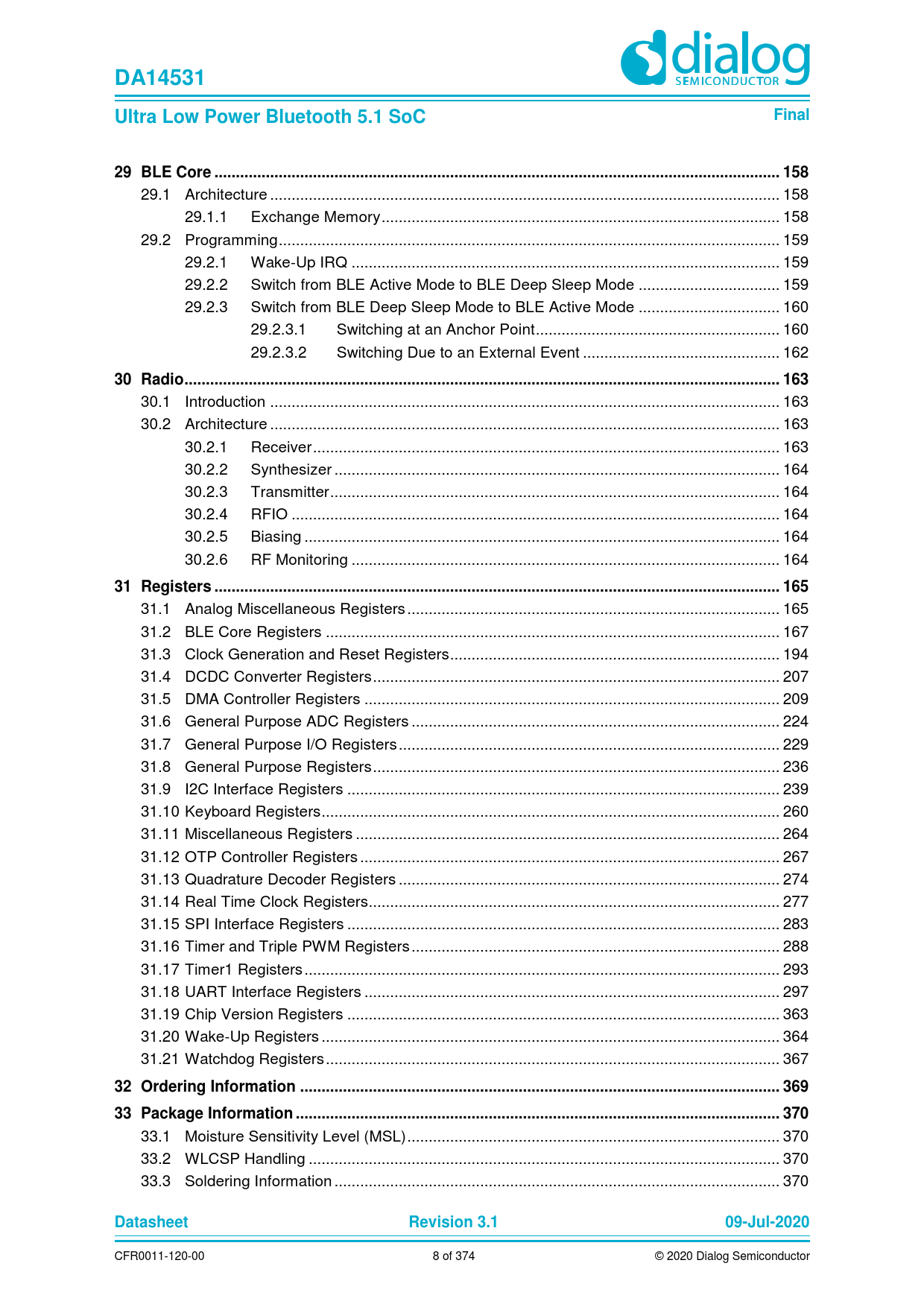 | Seiten / Seite | 374 / 8 — DA14531. Ultra Low Power Bluetooth 5.1 SoC. Final. 29 BLE Core .. 158. 30 … |