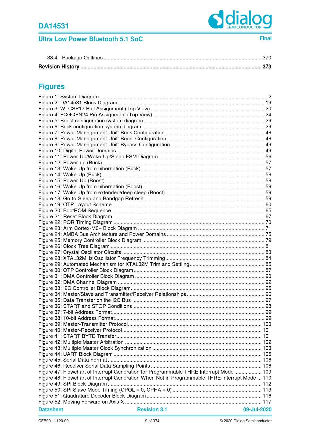 Figure 1: System Diagram ... 2 Figure 2: DA14531 Block Diagram .. 19 Figure 3: WLCSP17 Ball Assignment (Top View) ... 20 Figure 4: FCGQFN24 Pin Assignment (Top View) ... 24 Figure 5: Boost configuration system diagram .. 29 Figure 6: Buck configuration system diagram ... 29 Figure 7: Power Management Unit: Buck Configuration ... 48 Figure 8: Power Management Unit: Boost Configuration .. 48 Figure 9: Power Management Unit: Bypass Configuration ... 49 Figure 10: Digital Power Domains ... 49 Figure 11: Power-Up/Wake-Up/Sleep FSM Diagram .. 56 Figure 12: Power-up (Buck)... 57 Figure 13: Wake-Up from hibernation (Buck) .. 57 Figure 14: Wake-Up (Buck) ... 58 Figure 15: Power-Up (Boost) ... 58 Figure 16: Wake-Up from hibernation (Boost)... 59 Figure 17: Wake-Up from extended/deep sleep (Boost) ... 59 Figure 18: Go-to-Sleep and Bandgap Refresh .. 59 Figure 19: OTP Layout Scheme .. 60 Figure 20: BootROM Sequence .. 65 Figure 21: Reset Block Diagram ... 67 Figure 22: POR Timing Diagram ... 70 Figure 23: Arm Cortex-M0+ Block Diagram .. 71 Figure 24: AMBA Bus Architecture and Power Domains .. 75 Figure 25: Memory Controller Block Diagram ... 79 Figure 26: Clock Tree Diagram ... 81 Figure 27: Crystal Oscillator Circuits ... 83 Figure 28: XTAL32MHz Oscillator Frequency Trimming ... 84 Figure 29: Automated Mechanism for XTAL32M Trim and Settling .. 85 Figure 30: OTP Controller Block Diagram ... 87 Figure 31: DMA Controller Block Diagram .. 90 Figure 32: DMA Channel Diagram .. 92 Figure 33: I2C Controller Block Diagram ... 95 Figure 34: Master/Slave and Transmitter/Receiver Relationships .. 96 Figure 35: Data Transfer on the I2C Bus .. 97 Figure 36: START and STOP Conditions .. 98 Figure 37: 7-bit Address Format .. 99 Figure 38: 10-bit Address Format .. 99 Figure 39: Master-Transmitter Protocol ... 100 Figure 40: Master-Receiver Protocol ... 101 Figure 41: START BYTE Transfer ... 101 Figure 42: Multiple Master Arbitration ... 102 Figure 43: Multiple Master Clock Synchronization .. 103 Figure 44: UART Block Diagram ... 105 Figure 45: Serial Data Format ... 106 Figure 46: Receiver Serial Data Sampling Points ... 106 Figure 47: Flowchart of Interrupt Generation for Programmable THRE Interrupt Mode ... 109 Figure 48: Flowchart of Interrupt Generation When Not in Programmable THRE Interrupt Mode ... 110 Figure 49: SPI Block Diagram ... 112 Figure 50: SPI Slave Mode Timing (CPOL = 0, CPHA = 0) .. 113 Figure 51: Quadrature Decoder Block Diagram .. 116 Figure 52: Moving Forward on Axis X ... 117
