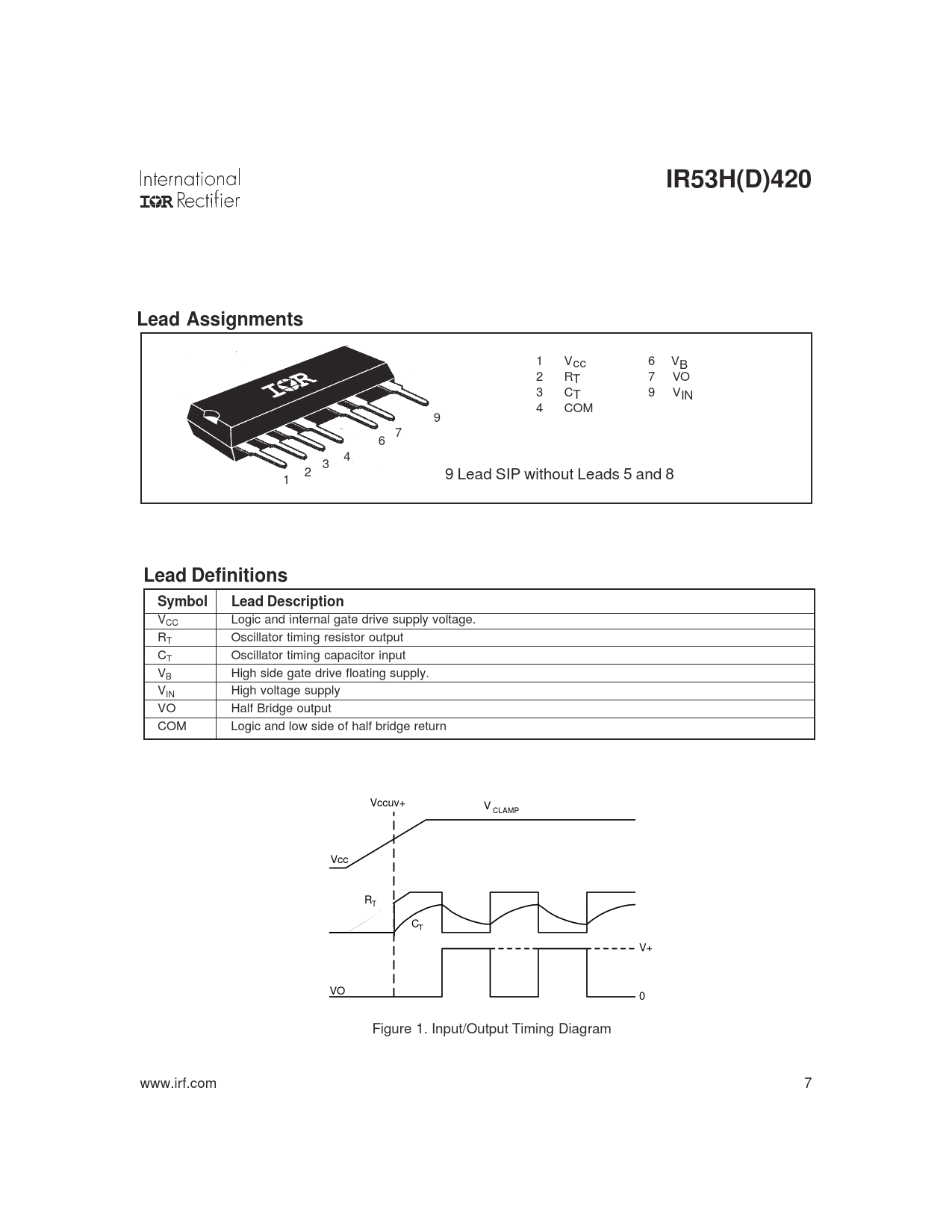 | Seiten / Seite | 8 / 7 — IR53H(D)420. Lead Assignments. Lead Definitions. Symbol. Lead Description |