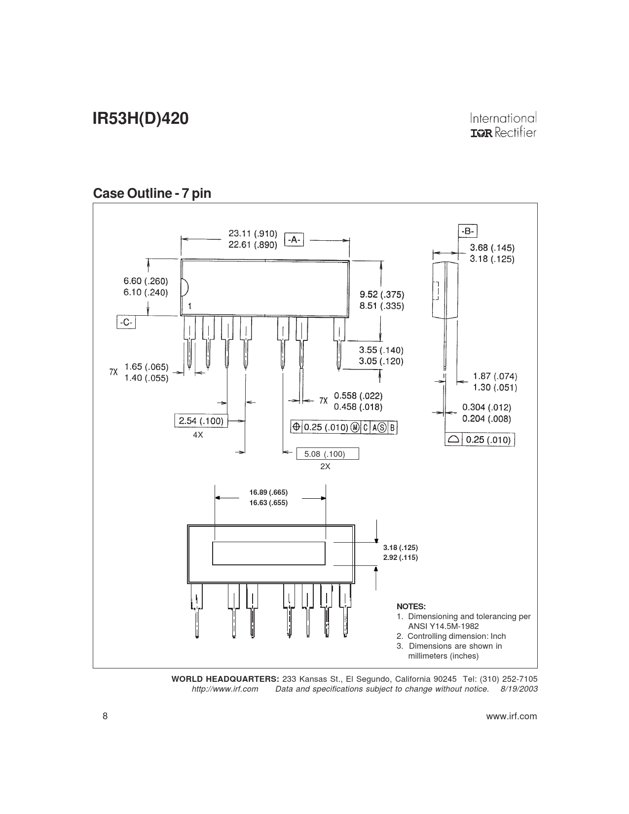 IR53H(D)420 Case Outline - 7 pin 16.89 (.665) 16.63 (.655) 3.18 (.125) 2.92 (.115) NOTES: WORLD HEADQUARTERS: