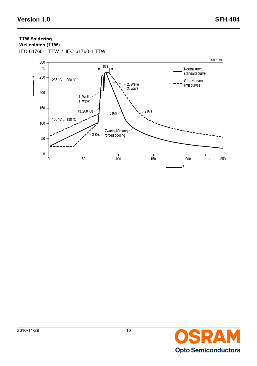 IEC-61760-1 TTW / IEC-61760-1 TTW OHLY0598 300 C 10 s Normalkurve standard curve T 250 235 C ... 260 C Grenzkurven 2. Welle limit curves 2. wave 200 1. Welle 1. wave 150 ca 200 K/s 2 K/s 5 K/s 100 C ... 130 C 100 Zwangskühlung 2 K/s forced cooling 50 0 0 50 100 150 200 s 250 t 2010-11-29 10 Document Outline Features: Besondere Merkmale: Applications Anwendungen Notes Hinweise Ordering Information Bestellinformation Maximum Ratings Grenzwerte Characteristics Kennwerte Grouping Gruppierung Relative Spectral Emission Relative spektrale Emission Radiant Intensity Strahlstärke Forward Current Durchlassstrom Forward Current vs. Lead Length between the package bottom and the PCB Flussstrom gg. Beinchenlänge zwischen Gehäuseunterseite und PCB Radiation Characteristics Abstrahlcharakteristik Package Outline Maßzeichnung Recommended Solder Pad Empfohlenes Lötpaddesign Disclaimer Disclaimer Glossary Glossar