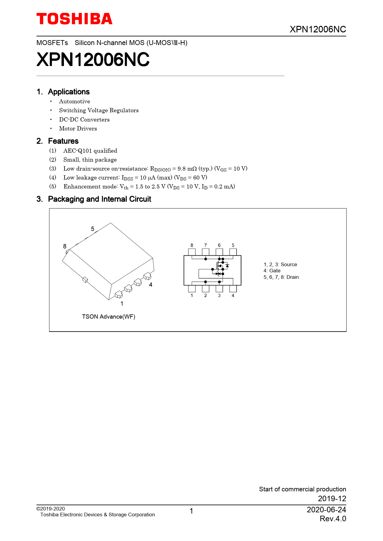 XPN12006NC MOSFETs Silicon N-channel MOS (U-MOS-H) XPN12006NC 1. Applications • Automotive • Switching Voltage Regulators • DC-DC Converters • Motor Drivers 2. Features (1) AEC-Q101 qualified (2) Small, thin package (3) Low drain-source on-resistance: RDS(ON) = 9.8 mΩ (typ.) (VGS = 10 V) (4) Low leakage current: IDSS = 10 µA (max) (VDS = 60 V) (5) Enhancement mode: Vth = 1.5 to 2.5 V (VDS = 10 V, ID = 0.2 mA) 3. Packaging and Internal Circuit 1, 2, 3: Source 4: Gate 5, 6, 7, 8: Drain TSON Advance(WF) Start of commercial production 2019-12 ©2019-2020 1 2020-06-24 Toshiba Electronic Devices & Storage Corporation Rev.4.0