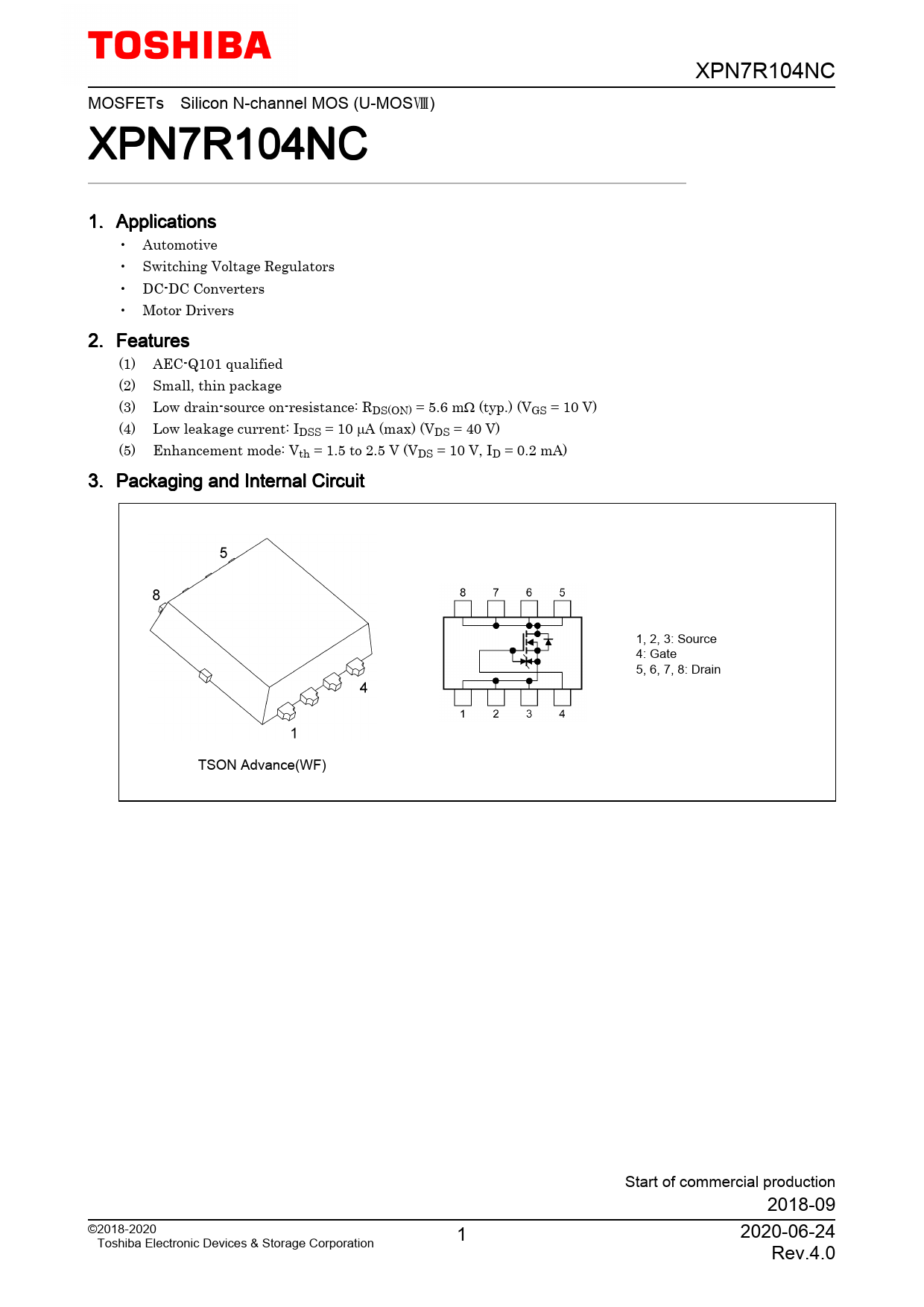 XPN7R104NC. MOSFETs. Silicon. N-channel. MOS. (U-MOS). XPN7R104NC. 1. Applications. •. Automotive. •. Switching. Voltage. Regulators. •. DC-DC