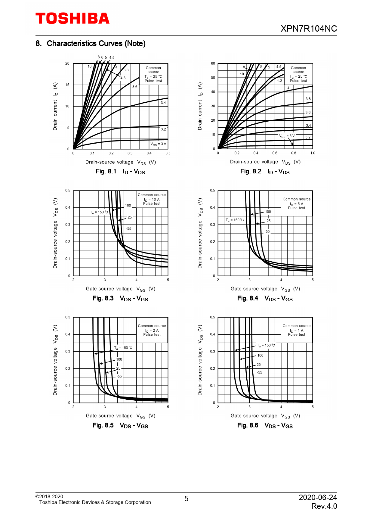 XPN7R104NC. 8. Characteristics. Curves. (Note). Fig. 8.1. ID. -. VDS. Fig. 8.2. ID. -. VDS. Fig. 8.3. VDS. -. VGS. Fig. 8.4. VDS. -. VGS. Fig. 8.5. VDS. -. VGS. Fig. 8.6. VDS. -. VGS