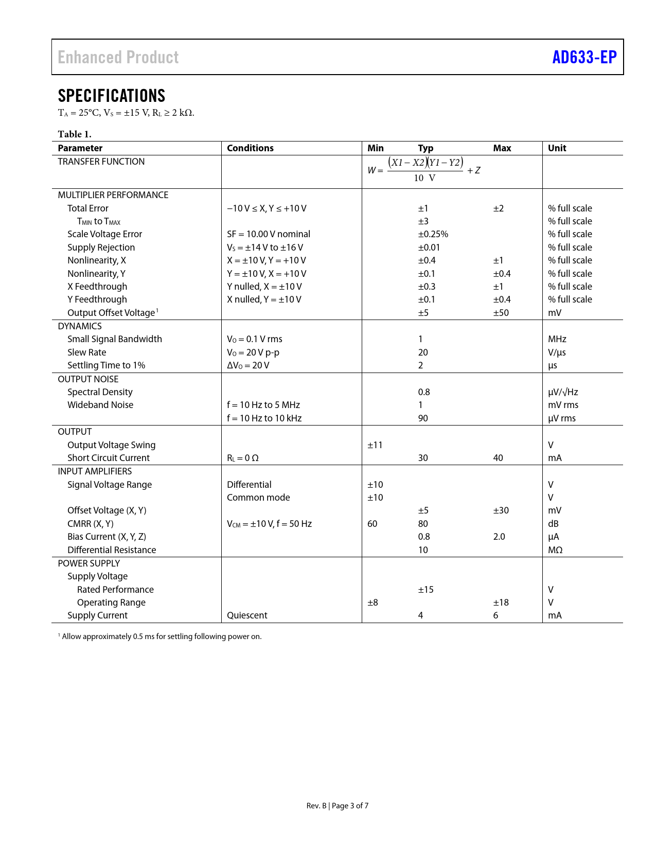 Seiten / Seite7 / 3 — Enhanced Product. AD633-EP. SPECIFICATIONS. Table 1. Parameter. …