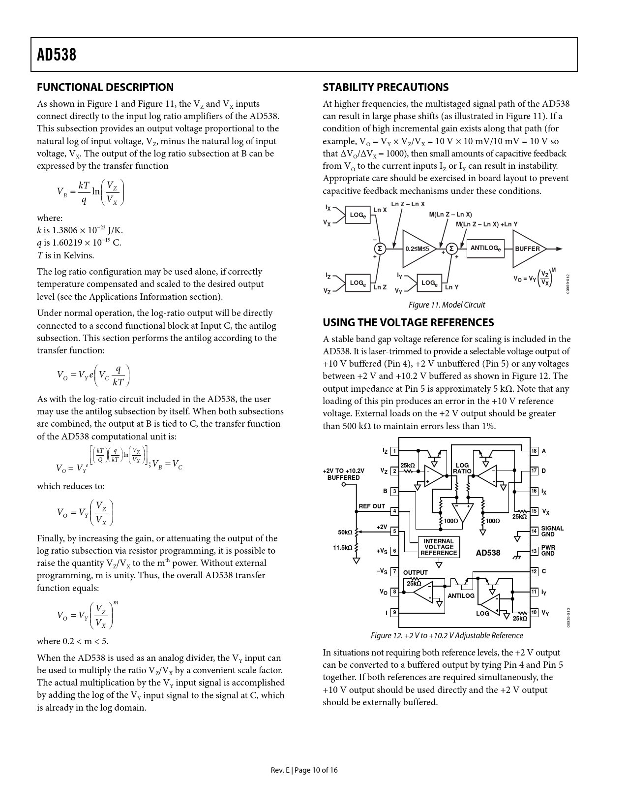 link to page 1 link to page 10 link to page 15 link to page 10 link to page 10 AD538FUNCTIONAL DESCRIPTIONSTABILITY PRECAUTIONS As shown in Figure 1 and Figure 11, the VZ and VX inputs At higher frequencies, the multistaged signal path of the AD538 connect directly to the input log ratio amplifiers of the AD538. can result in large phase shifts (as illustrated in Figure 11). If a This subsection provides an output voltage proportional to the condition of high incremental gain exists along that path (for natural log of input voltage, VZ, minus the natural log of input example, VO = VY × VZ/VX = 10 V × 10 mV/10 mV = 10 V so voltage, VX. The output of the log ratio subsection at B can be that ΔVO/ΔVX = 1000), then smal amounts of capacitive feedback expressed by the transfer function from VO to the current inputs IZ or IX can result in instability. Appropriate care should be exercised in board layout to prevent kT V V = Z capacitive feedback mechanisms under these conditions. B ln q VX ILn Z – Ln XXLn X where: LOGeM(Ln Z – Ln X)V k is 1.3806 × 10−23 J/K. XM(Ln Z – Ln X) +Ln Y q is 1.60219 × 10−19 C. –Σ0.2≤M≤5ΣANTILOGeBUFFER T is in Kelvins. +++ The log ratio configuration may be used alone, if correctly MIIVZYZ temperature compensated and scaled to the desired output V 012 O = VYLOGLOGVeeXLn ZLn Y level (see the Applications Information section). VVZY 00959- Figure 11. Model Circuit Under normal operation, the log-ratio output will be directly connected to a second functional block at Input C, the antilog USING THE VOLTAGE REFERENCES subsection. This section performs the antilog according to the A stable band gap voltage reference for scaling is included in the transfer function: AD538. It is laser-trimmed to provide a selectable voltage output of q +10 V buffered (Pin 4), +2 V unbuffered (Pin 5) or any voltages V = O VYeVC kT between +2 V and +10.2 V buffered as shown in Figure 12. The output impedance at Pin 5 is approximately 5 kΩ. Note that any As with the log-ratio circuit included in the AD538, the user loading of this pin produces an error in the +10 V reference may use the antilog subsection by itself. When both subsections voltage. External loads on the +2 V output should be greater are combined, the output at B is tied to C, the transfer function than 500 kΩ to maintain errors less than 1%. of the AD538 computational unit is: kT q V Z I Z181A ln Q kT V X V e ;V = B C V 25kΩLOG O = VY +2V TO +10.2VV2ZRATIO17DBUFFERED which reduces to: B316IX V V = Z REF OUT415V O Y V X V 25kΩ X 100Ω100Ω+2VSIGNAL514 Finally, by increasing the gain, or attenuating the output of the 50kΩGNDINTERNAL log ratio subsection via resistor programming, it is possible to 11.5kΩVOLTAGEPWR+V6SREFERENCEAD53813GND raise the quantity VZ/VX to the mth power. Without external programming, m is unity. Thus, the overal AD538 transfer –V7SOUTPUT12C function equals: 25kΩV811OIANTILOGY m V Z = 9ILOG10VY 013 O V Y V V 25kΩ X 00959- where 0.2 < m < 5. Figure 12. +2 V to +10.2 V Adjustable Reference When the AD538 is used as an analog divider, the V In situations not requiring both reference levels, the +2 V output Y input can be used to multiply the ratio V can be converted to a buffered output by tying Pin 4 and Pin 5 Z/VX by a convenient scale factor. The actual multiplication by the V together. If both references are required simultaneously, the Y input signal is accomplished by adding the log of the V +10 V output should be used directly and the +2 V output Y input signal to the signal at C, which is already in the log domain. should be external y buffered. Rev. E | Page 10 of 16 Document Outline Features Applications Functional Block Diagram General Description Revision History Specifications Absolute Maximum Ratings ESD Caution Pin Configuration and Function Descriptions Typical Performance Characteristics Theory of Operation Re-Examination of Multiplier/Divider Accuracy Functional Description Stability Precautions Using The Voltage References One-Quadrant Multiplication/Division Two-Quadrant Division Log Ratio Operation Analog Computation Of Powers And Roots Square Root Operation Applications Information Transducer Linearization ARC-Tangent Approximation Outline Dimensions Ordering Guide
