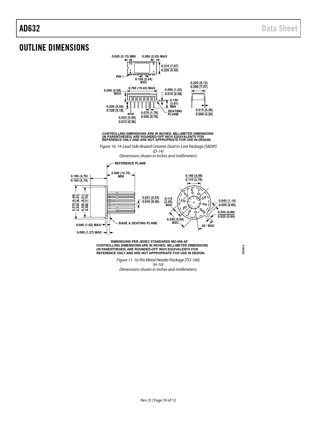 Seiten / Seite12 / 10 — AD632. Data Sheet. OUTLINE DIMENSIONS. 0.005 (0.13) MIN. 0.080 (2.03) …
