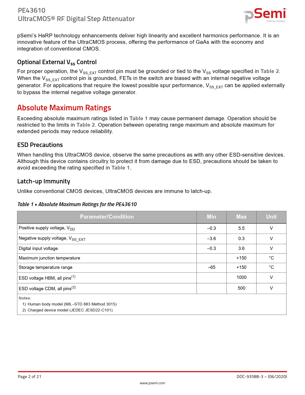 link to page 2 link to page 3 link to page 2 link to page 3 link to page 2 PE43610UltraCMOS® RF Digital Step Attenuator pSemi’s HaRP technology enhancements deliver high linearity and excel ent harmonics performance. It is an innovative feature of the UltraCMOS process, offering the performance of GaAs with the economy and integration of conventional CMOS. Optional External VSS Control For proper operation, the VSS_EXT control pin must be grounded or tied to the VSS voltage specified in Table 2 . When the VSS_EXT control pin is grounded, FETs in the switch are biased with an internal negative voltage generator. For applications that require the lowest possible spur performance, VSS_EXT can be applied external y to bypass the internal negative voltage generator. Absolute Maximum Ratings Exceeding absolute maximum ratings listed in Table 1 may cause permanent damage. Operation should be restricted to the limits in Table 2 . Operation between operating range maximum and absolute maximum for extended periods may reduce reliability. ESD Precautions When handling this UltraCMOS device, observe the same precautions as with any other ESD-sensitive devices. Although this device contains circuitry to protect it from damage due to ESD, precautions should be taken to avoid exceeding the rating specified in Table 1 . Latch-up Immunity Unlike conventional CMOS devices, UltraCMOS devices are immune to latch-up. Table 1 • Absolute Maximum Ratings for the PE43610Parameter/ConditionMinMaxUnit Positive supply voltage, VDD –0.3 5.5 V Negative supply voltage, VSS_EXT –3.6 0.3 V Digital input voltage –0.3 3.6 V Maximum junction temperature +150 °C Storage temperature range –65 +150 °C ESD voltage HBM, al pins (1) 1000 V ESD voltage CDM, al pins (2) 500 V Notes: 1) Human body model (MIL–STD 883 Method 3015) 2) Charged device model (JEDEC JESD22-C101). Page 2 of 21 DOC-93588-3 – (06/2020) www.psemi.com Document Outline Features Applications Product Description Optional External VSS Control Absolute Maximum Ratings ESD Precautions Latch-up Immunity Recommended Operating Conditions Electrical Specifications Switching Frequency Spur-free Performance Glitch-safe Attenuation State The PE43610 features a novel architecture to provide safe transition behavior when changing attenuation states. When RF input power is applied, positive output power spikes are prevented during attenuation state changes by optimized internal timing c... Truth Tables Serial Addressable Register Map Programming Options Parallel/Serial Selection Parallel Mode Interface For direct parallel programming, the LE line should be pulled HIGH. Changing attenuation state control values changes the device state to new attenuation. Direct mode is ideal for manual control of the device (using hardwire, switches, or jumpers). Serial-Addressable Interface Power-up Control Settings Typical Performance Data Pin Configuration Packaging Information Moisture Sensitivity Level Package Drawing Top-Marking Specification Tape and Reel Specification Ordering Information