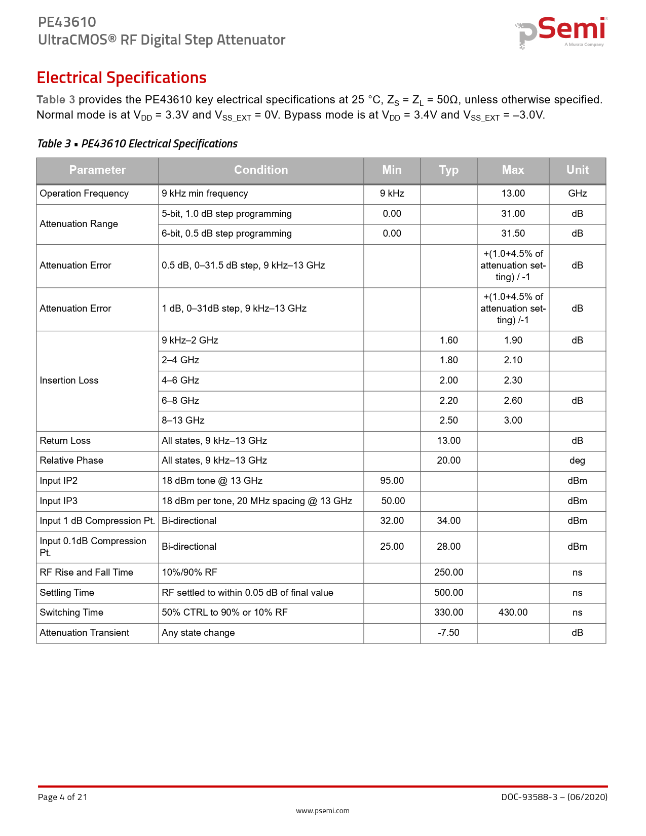 PE43610 UltraCMOS® RF Digital Step Attenuator Electrical Specifications Table 3