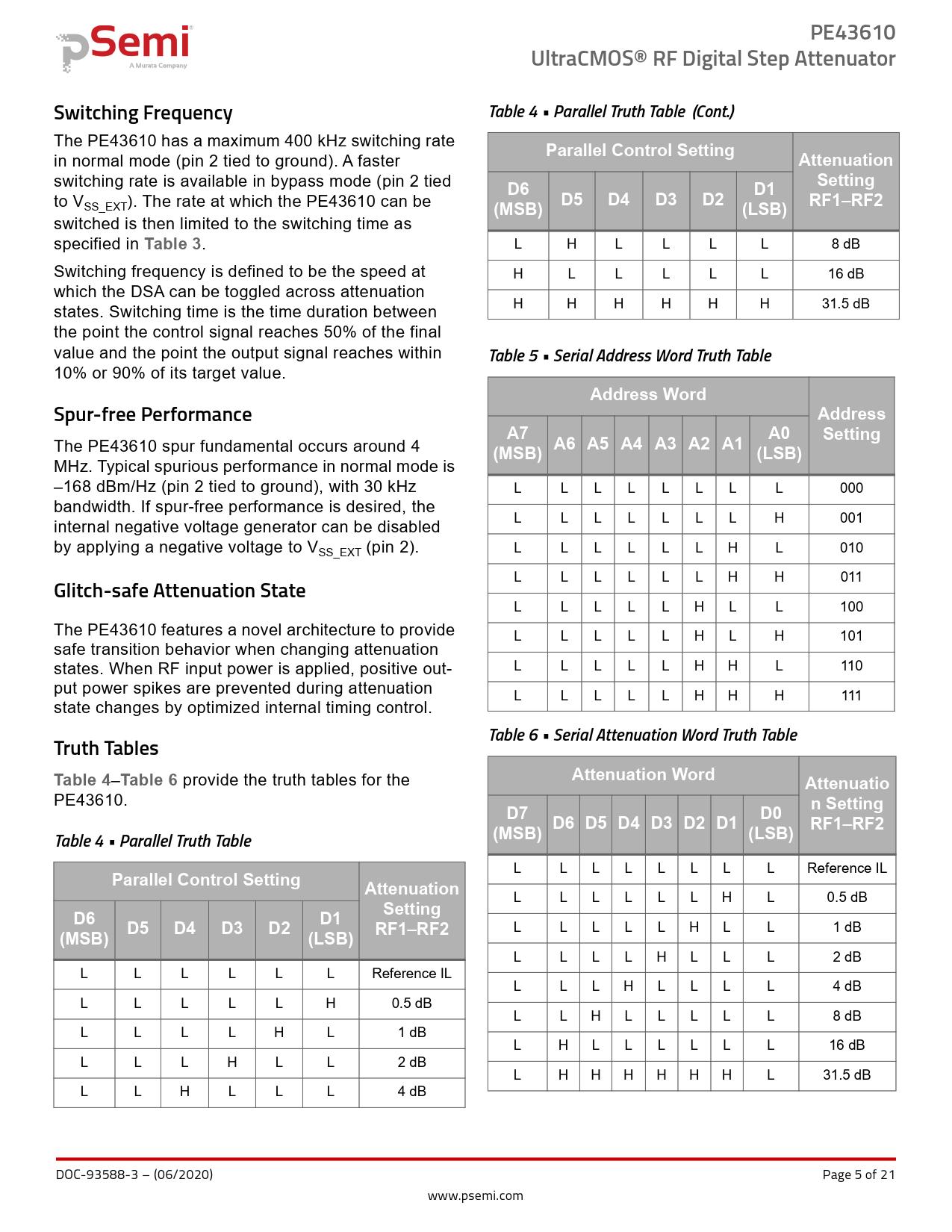 L L L L L H L L 1 dB L L L L H L L L 2 dB L L L L L L Reference IL L L L H L L L L 4 dB L L L L L H 0.5 dB L L H L L L L L 8 dB L L L L H L 1 dB L H L L L L L L 16 dB L L L H L L 2 dB L H H H H H H L 31.5 dB L L H L L L 4 dB DOC-93588-3 – (06/2020) Page 5 of 21 www.psemi.com Document Outline Features Applications Product Description Optional External VSS Control Absolute Maximum Ratings ESD Precautions Latch-up Immunity Recommended Operating Conditions Electrical Specifications Switching Frequency Spur-free Performance Glitch-safe Attenuation State The PE43610 features a novel architecture to provide safe transition behavior when changing attenuation states. When RF input power is applied, positive output power spikes are prevented during attenuation state changes by optimized internal timing c... Truth Tables Serial Addressable Register Map Programming Options Parallel/Serial Selection Parallel Mode Interface For direct parallel programming, the LE line should be pulled HIGH. Changing attenuation state control values changes the device state to new attenuation. Direct mode is ideal for manual control of the device (using hardwire, switches, or jumpers). Serial-Addressable Interface Power-up Control Settings Typical Performance Data Pin Configuration Packaging Information Moisture Sensitivity Level Package Drawing Top-Marking Specification Tape and Reel Specification Ordering Information