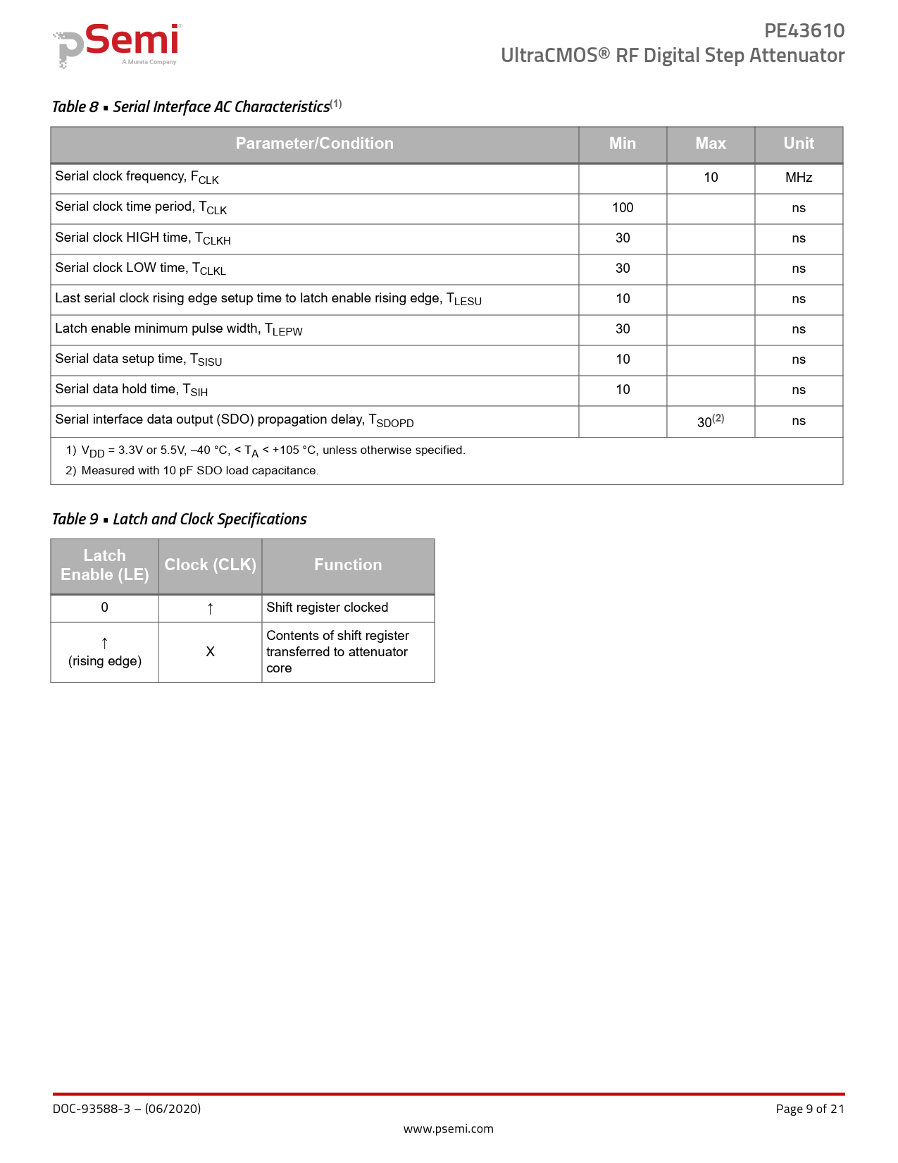 PE43610. UltraCMOS® RF Digital Step Attenuator. Table 8 • Serial Interface AC Characteristics. (1). Parameter/Condition. Min. Max