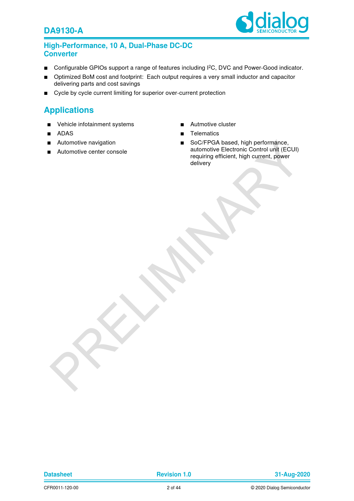 DA9130-A. High-Performance, 10 A, Dual-Phase DC-DC. Converter. Applications. Datasheet. Revision 1.0. 31-Aug-2020