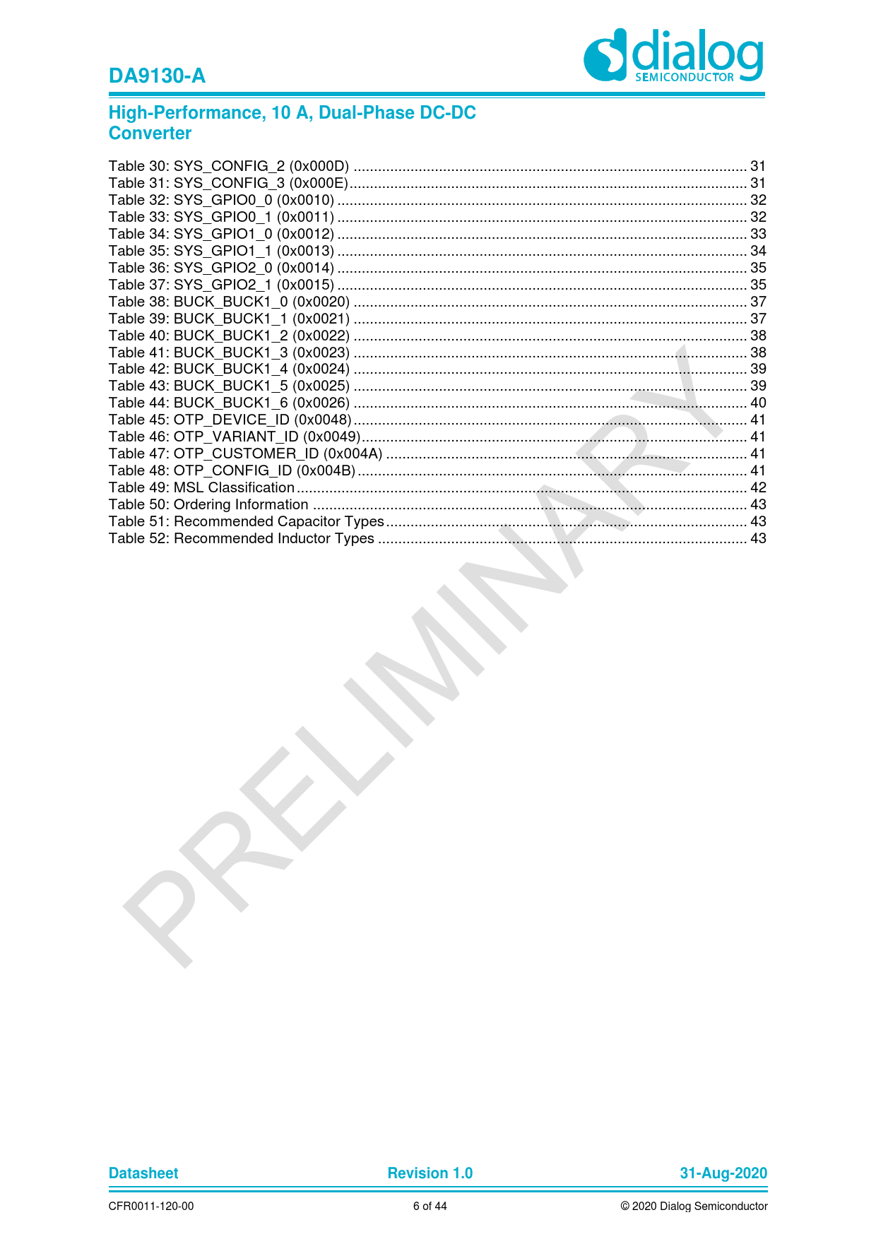 Table 30: SYS_CONFIG_2 (0x000D) ... 31 Table 31: SYS_CONFIG_3 (0x000E) .. 31 Table 32: SYS_GPIO0_0 (0x0010) ... 32 Table 33: SYS_GPIO0_1 (0x0011) ... 32 Table 34: SYS_GPIO1_0 (0x0012) ... 33 Table 35: SYS_GPIO1_1 (0x0013) ... 34 Table 36: SYS_GPIO2_0 (0x0014) ... 35 Table 37: SYS_GPIO2_1 (0x0015) ... 35 Table 38: BUCK_BUCK1_0 (0x0020) ... 37 Table 39: BUCK_BUCK1_1 (0x0021) ... 37 Table 40: BUCK_BUCK1_2 (0x0022) ... 38 Table 41: BUCK_BUCK1_3 (0x0023) ... 38 Table 42: BUCK_BUCK1_4 (0x0024) ... 39 Table 43: BUCK_BUCK1_5 (0x0025) ... 39 Table 44: BUCK_BUCK1_6 (0x0026) ... 40 Table 45: OTP_DEVICE_ID (0x0048) ... 41 Table 46: OTP_VARIANT_ID (0x0049) ... 41 Table 47: OTP_CUSTOMER_ID (0x004A) ... 41 Table 48: OTP_CONFIG_ID (0x004B) .. 41 Table 49: MSL Classification ... 42 Table 50: Ordering Information ... 43 Table 51: Recommended Capacitor Types ... 43 Table 52: Recommended Inductor Types ... 43