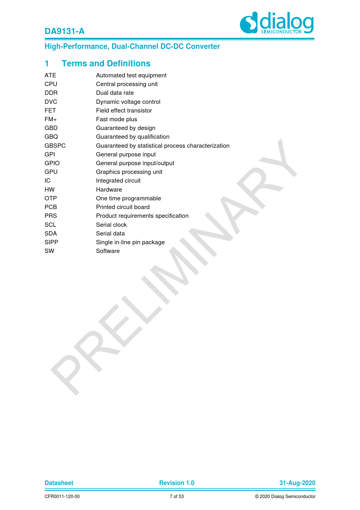 DA9131-A. High-Performance, Dual-Channel DC-DC Converter. Terms and Definitions. Datasheet. Revision 1.0. 31-Aug-2020