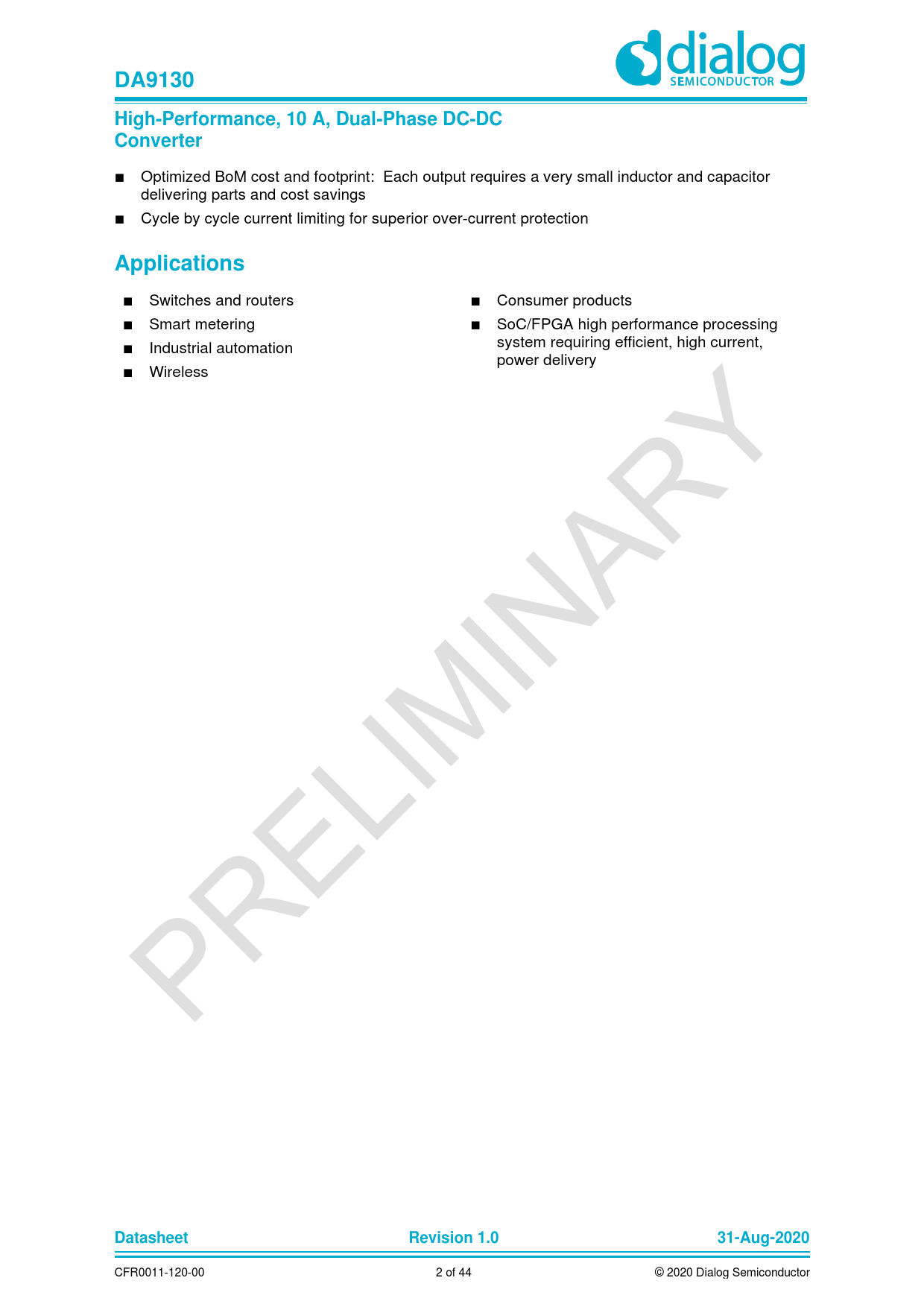 DA9130. High-Performance, 10 A, Dual-Phase DC-DC. Converter. Applications. Datasheet. Revision 1.0. 31-Aug-2020