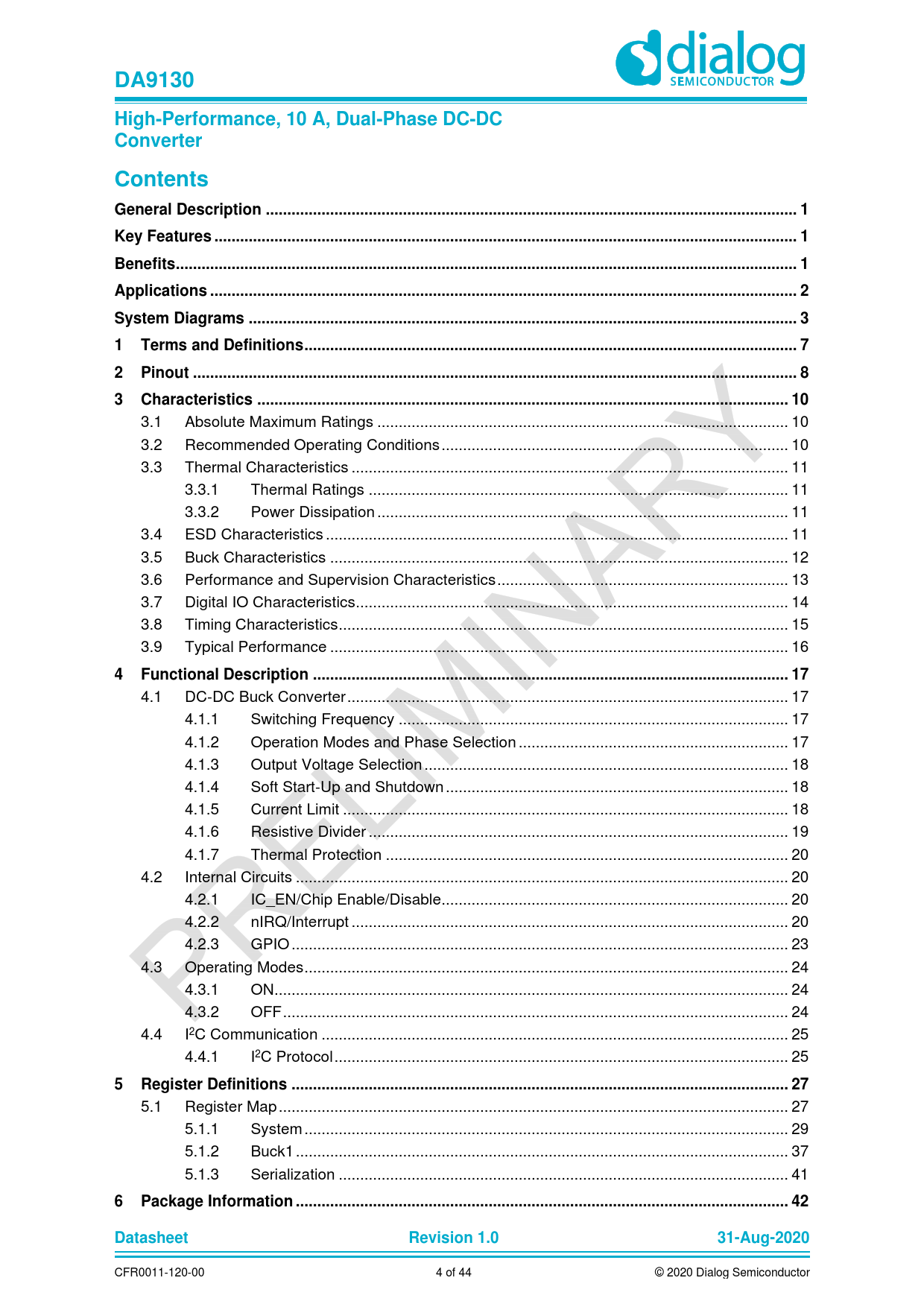 | Seiten / Seite | 44 / 4 — DA9130. High-Performance, 10 A, Dual-Phase DC-DC. Converter. Contents. … |
