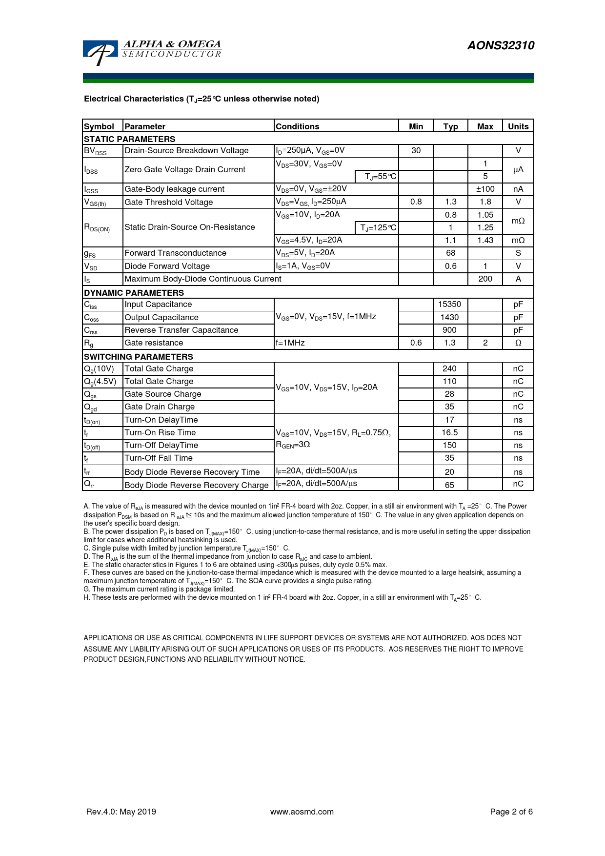 AONS32310Electrical Characteristics (TJ=25°C unless otherwise noted)SymbolParameterConditionsMinTypMaxUnitsSTATIC PARAMETERS BV =250μA, V DSS Drain-Source Breakdown Voltage ID GS=0V 30 V VDS=30V, VGS=0V 1 I Zero Gate Voltage Drain Current μA DSS TJ=55°C 5 I Gate-Body leakage current V GSS DS=0V, VGS=±20V ±100 nA VGS(th) Gate Threshold Voltage VDS=VGS, ID=250mA 0.8 1.3 1.8 V VGS=10V, ID=20A 0.8 1.05 mΩ RDS(ON) Static Drain-Source On-Resistance TJ=125°C 1 1.25 VGS=4.5V, ID=20A 1.1 1.43 mΩ g V FS Forward Transconductance DS=5V, ID=20A 68 S V I SD Diode Forward Voltage S=1A, VGS=0V 0.6 1 V IS Maximum Body-Diode Continuous Current 200 A DYNAMIC PARAMETERS Ciss Input Capacitance 15350 pF C Output Capacitance V oss GS=0V, VDS=15V, f=1MHz 1430 pF Crss Reverse Transfer Capacitance 900 pF Rg Gate resistance f=1MHz 0.6 1.3 2 Ω SWITCHING PARAMETERS Qg(10V) Total Gate Charge 240 nC Qg(4.5V) Total Gate Charge 110 nC VGS=10V, VDS=15V, ID=20A Qgs Gate Source Charge 28 nC Qgd Gate Drain Charge 35 nC tD(on) Turn-On DelayTime 17 ns tr Turn-On Rise Time VGS=10V, VDS=15V, RL=0.75W, 16.5 ns t R D(off) Turn-Off DelayTime GEN=3W 150 ns tf Turn-Off Fall Time 35 ns trr Body Diode Reverse Recovery Time IF=20A, di/dt=500A/ms 20 ns Qrr Body Diode Reverse Recovery Charge IF=20A, di/dt=500A/ms 65 nC A. The value of Rq is measured with the device mounted on 1in2 FR-4 board with 2oz. Copper, in a still air environment with T =25°C. The Power JA A dissipation P is based on R t≤ 10s and the maximum allowed junction temperature of 150°C. The value in any given application depends on DSM qJA the user's specific board design. B. The power dissipation P is based on T =150°C, using junction-to-case thermal resistance, and is more useful in setting the upper dissipation D J(MAX) limit for cases where additional heatsinking is used. C. Single pulse width limited by junction temperature T =150°C. J(MAX) D. The Rq is the sum of the thermal impedance from junction to case R and case to ambient. JA qJC E. The static characteristics in Figures 1 to 6 are obtained using <300ms pulses, duty cycle 0.5% max. F. These curves are based on the junction-to-case thermal impedance which is measured with the device mounted to a large heatsink, assuming a maximum junction temperature of T =150°C. The SOA curve provides a single pulse rating. J(MAX) G. The maximum current rating is package limited. H. These tests are performed with the device mounted on 1 in2 FR-4 board with 2oz. Copper, in a still air environment with T =25°C. A APPLICATIONS OR USE AS CRITICAL COMPONENTS IN LIFE SUPPORT DEVICES OR SYSTEMS ARE NOT AUTHORIZED. AOS DOES NOT ASSUME ANY LIABILITY ARISING OUT OF SUCH APPLICATIONS OR USES OF ITS PRODUCTS. AOS RESERVES THE RIGHT TO IMPROVE PRODUCT DESIGN,FUNCTIONS AND RELIABILITY WITHOUT NOTICE. Rev.4.0: May 2019 www.aosmd.com Page 2 of 6