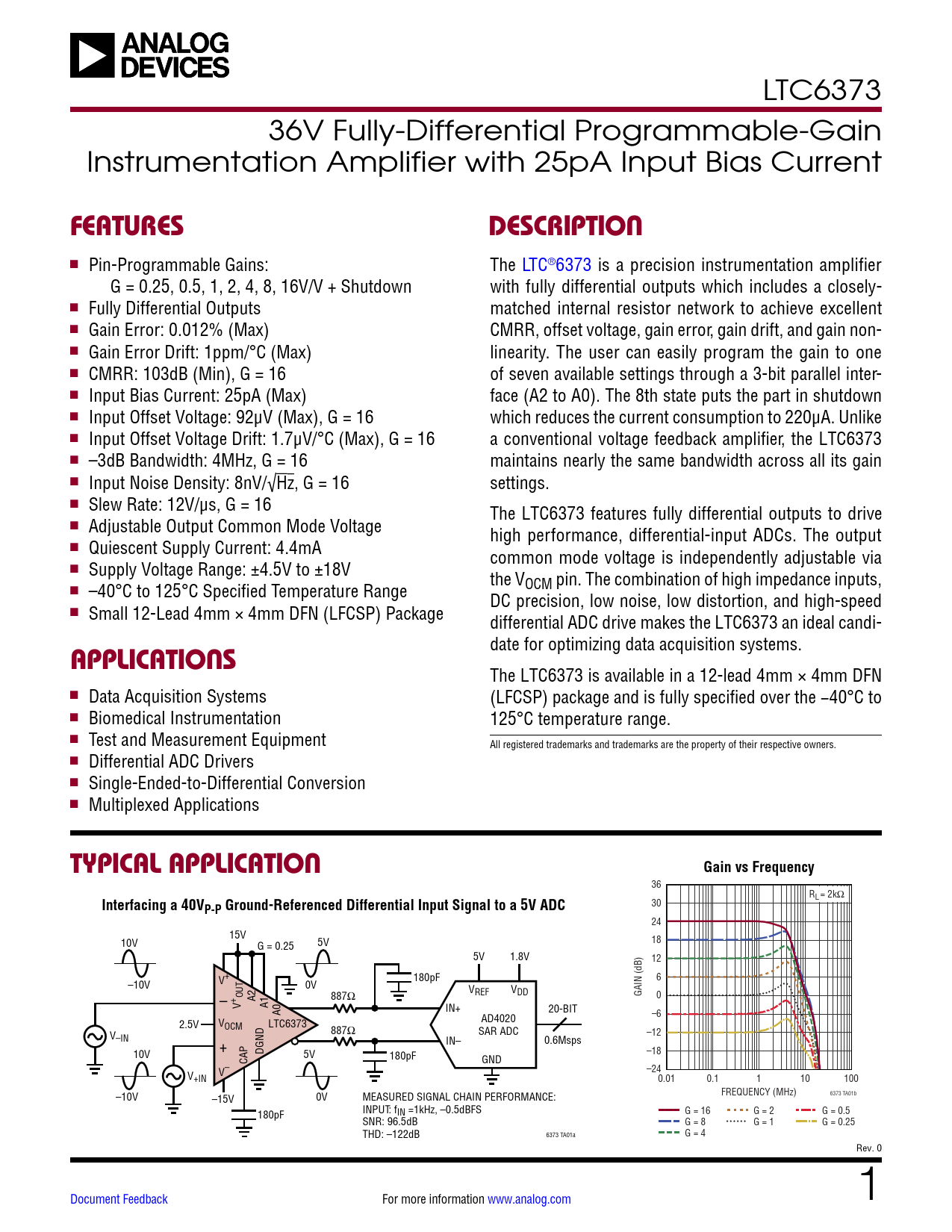 LTC6373 36V Fully-Differential Programmable-Gain Instrumentation Amplifier with 25pA Input Bias Current FEATURESDESCRIPTION n Pin-Programmable Gains: The LTC®6373 is a precision instrumentation amplifier G = 0.25, 0.5, 1, 2, 4, 8, 16V/V + Shutdown with fully differential outputs which includes a closely- n Fully Differential Outputs matched internal resistor network to achieve excellent n Gain Error: 0.012% (Max) CMRR, offset voltage, gain error, gain drift, and gain non- n Gain Error Drift: 1ppm/°C (Max) linearity. The user can easily program the gain to one n CMRR: 103dB (Min), G = 16 of seven available settings through a 3-bit parallel inter- n Input Bias Current: 25pA (Max) face (A2 to A0). The 8th state puts the part in shutdown n Input Offset Voltage: 92μV (Max), G = 16 which reduces the current consumption to 220μA. Unlike n Input Offset Voltage Drift: 1.7μV/°C (Max), G = 16 a conventional voltage feedback amplifier, the LTC6373 n –3dB Bandwidth: 4MHz, G = 16 maintains nearly the same bandwidth across all its gain n Input Noise Density: 8nV/√Hz, G = 16 settings. n Slew Rate: 12V/μs, G = 16 The LTC6373 features fully differential outputs to drive n Adjustable Output Common Mode Voltage high performance, differential-input ADCs. The output n Quiescent Supply Current: 4.4mA common mode voltage is independently adjustable via n Supply Voltage Range: ±4.5V to ±18V the VOCM pin. The combination of high impedance inputs, n –40°C to 125°C Specified Temperature Range DC precision, low noise, low distortion, and high-speed n Small 12-Lead 4mm × 4mm DFN (LFCSP) Package differential ADC drive makes the LTC6373 an ideal candi- date for optimizing data acquisition systems. APPLICATIONS The LTC6373 is available in a 12-lead 4mm × 4mm DFN n Data Acquisition Systems (LFCSP) package and is fully specified over the −40°C to n Biomedical Instrumentation 125°C temperature range. n Test and Measurement Equipment All registered trademarks and trademarks are the property of their respective owners. n Differential ADC Drivers n Single-Ended-to-Differential Conversion n Multiplexed Applications TYPICAL APPLICATIONGain vs FrequencyGain vs Frequency 36 R Interfacing a 40V L = 2kΩ P-P Ground-Referenced Differential Input Signal to a 5V ADC 30 24 15V 18 10V G = 0.25 5V 5V 1.8V 12 180pF 6 V+ –10V 0V VREF VDD GAIN (dB) A2 887Ω 0 – + OUTV A1 IN+ A0 20-BIT –6 2.5V VOCM LTC6373 AD4020 887Ω SAR ADC –12 V–IN + IN– 0.6Msps DGND –18 10V 5V CAP 180pF GND –24 V– V+IN 0.01 0.1 1 10 100 FREQUENCY (MHz) 6373 TA01b –10V –15V 0V MEASURED SIGNAL CHAIN PERFORMANCE: INPUT: fIN =1kHz, –0.5dBFS G = 16 G = 2 G = 0.5 180pF SNR: 96.5dB G = 8 G = 1 G = 0.25 THD: –122dB 6373 TA01a G = 4 Rev. 0 Document Feedback For more information www.analog.com 1 Document Outline Features Applications Typical Application Description Absolute Maximum Ratings Order Information Pin Configuration Electrical Characteristics Typical Performance Characteristics Pin Functions Simplified Block Diagram Applications Information Package Description Typical Application Related Parts