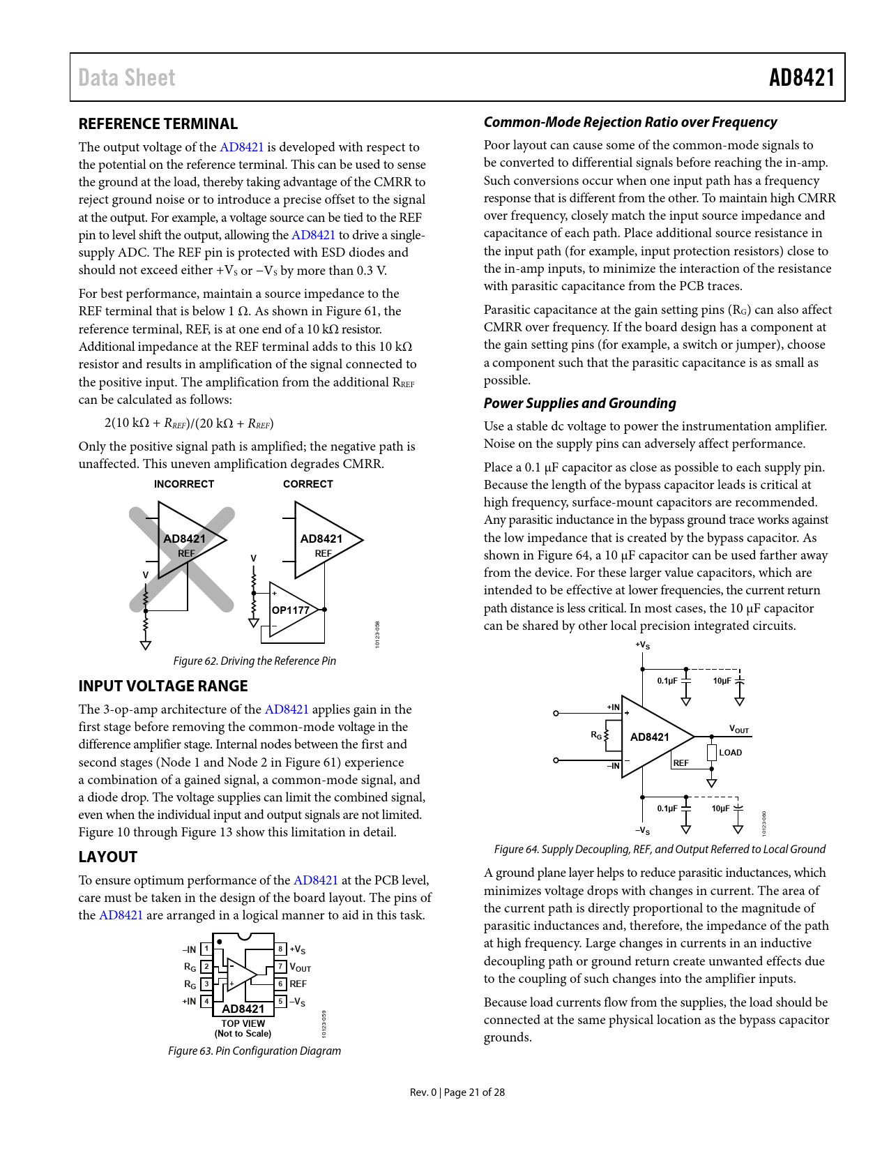 link to page 20 link to page 20 link to page 11 link to page 11 link to page 21 Data SheetAD8421REFERENCE TERMINALCommon-Mode Rejection Ratio over Frequency The output voltage of the AD8421 is developed with respect to Poor layout can cause some of the common-mode signals to the potential on the reference terminal. This can be used to sense be converted to differential signals before reaching the in-amp. the ground at the load, thereby taking advantage of the CMRR to Such conversions occur when one input path has a frequency reject ground noise or to introduce a precise offset to the signal response that is different from the other. To maintain high CMRR at the output. For example, a voltage source can be tied to the REF over frequency, closely match the input source impedance and pin to level shift the output, allowing the AD8421 to drive a single- capacitance of each path. Place additional source resistance in supply ADC. The REF pin is protected with ESD diodes and the input path (for example, input protection resistors) close to should not exceed either +VS or −VS by more than 0.3 V. the in-amp inputs, to minimize the interaction of the resistance with parasitic capacitance from the PCB traces. For best performance, maintain a source impedance to the REF terminal that is below 1 Ω. As shown in Figure 61, the Parasitic capacitance at the gain setting pins (RG) can also affect reference terminal, REF, is at one end of a 10 kΩ resistor. CMRR over frequency. If the board design has a component at Additional impedance at the REF terminal adds to this 10 kΩ the gain setting pins (for example, a switch or jumper), choose resistor and results in amplification of the signal connected to a component such that the parasitic capacitance is as small as the positive input. The amplification from the additional R possible. REF can be calculated as follows: Power Supplies and Grounding 2(10 kΩ + RREF)/(20 kΩ + RREF) Use a stable dc voltage to power the instrumentation amplifier. Only the positive signal path is amplified; the negative path is Noise on the supply pins can adversely affect performance. unaffected. This uneven amplification degrades CMRR. Place a 0.1 μF capacitor as close as possible to each supply pin. INCORRECTCORRECT Because the length of the bypass capacitor leads is critical at high frequency, surface-mount capacitors are recommended. Any parasitic inductance in the bypass ground trace works against AD8421AD8421 the low impedance that is created by the bypass capacitor. As REFREFV shown in Figure 64, a 10 μF capacitor can be used farther away V from the device. For these larger value capacitors, which are + intended to be effective at lower frequencies, the current return OP1177 path distance is less critical. In most cases, the 10 μF capacitor – 8 can be shared by other local precision integrated circuits. -05 23 101 +VS Figure 62. Driving the Reference Pin INPUT VOLTAGE RANGE0.1µF10µF The 3-op-amp architecture of the AD8421 applies gain in the +IN first stage before removing the common-mode voltage in the VROUTGAD8421 difference amplifier stage. Internal nodes between the first and LOAD second stages (Node 1 and Node 2 in Figure 61) experience –INREF a combination of a gained signal, a common-mode signal, and a diode drop. The voltage supplies can limit the combined signal, 0.1µF10µF even when the individual input and output signals are not limited. 60 -0 Figure 10 through Figure 13 show this limitation in detail. –VS 123 10 Figure 64. Supply Decoupling, REF, and Output Referred to Local Ground LAYOUT A ground plane layer helps to reduce parasitic inductances, which To ensure optimum performance of the AD8421 at the PCB level, minimizes voltage drops with changes in current. The area of care must be taken in the design of the board layout. The pins of the current path is directly proportional to the magnitude of the AD8421 are arranged in a logical manner to aid in this task. parasitic inductances and, therefore, the impedance of the path at high frequency. Large changes in currents in an inductive –IN 18 +VSR decoupling path or ground return create unwanted effects due 27GVOUTR to the coupling of such changes into the amplifier inputs. 36GREF+IN 45 –VSAD8421 Because load currents flow from the supplies, the load should be TOP VIEW 059 connected at the same physical location as the bypass capacitor 23- (Not to Scale) 101 grounds. Figure 63. Pin Configuration Diagram Rev. 0 | Page 21 of 28 Document Outline FEATURES APPLICATIONS PIN CONNECTION DIAGRAM GENERAL DESCRIPTION TABLE OF CONTENTS REVISION HISTORY SPECIFICATIONS AR AND BR GRADES ARM AND BRM GRADES ABSOLUTE MAXIMUM RATINGS THERMAL RESISTANCE ESD CAUTION PIN CONFIGURATION AND FUNCTION DESCRIPTIONS TYPICAL PERFORMANCE CHARACTERISTICS THEORY OF OPERATION ARCHITECTURE GAIN SELECTION RG Power Dissipation REFERENCE TERMINAL INPUT VOLTAGE RANGE LAYOUT Common-Mode Rejection Ratio over Frequency Power Supplies and Grounding Reference Pin INPUT BIAS CURRENT RETURN PATH INPUT VOLTAGES BEYOND THE SUPPLY RAILS Input Voltages Beyond the Maximum Ratings RADIO FREQUENCY INTERFERENCE (RFI) CALCULATING THE NOISE OF THE INPUT STAGE Source Resistance Noise Voltage Noise of the Instrumentation Amplifier Current Noise of the Instrumentation Amplifier Total Noise Density Calculation APPLICATIONS INFORMATION DIFFERENTIAL OUTPUT CONFIGURATION DRIVING AN ADC OUTLINE DIMENSIONS ORDERING GUIDE