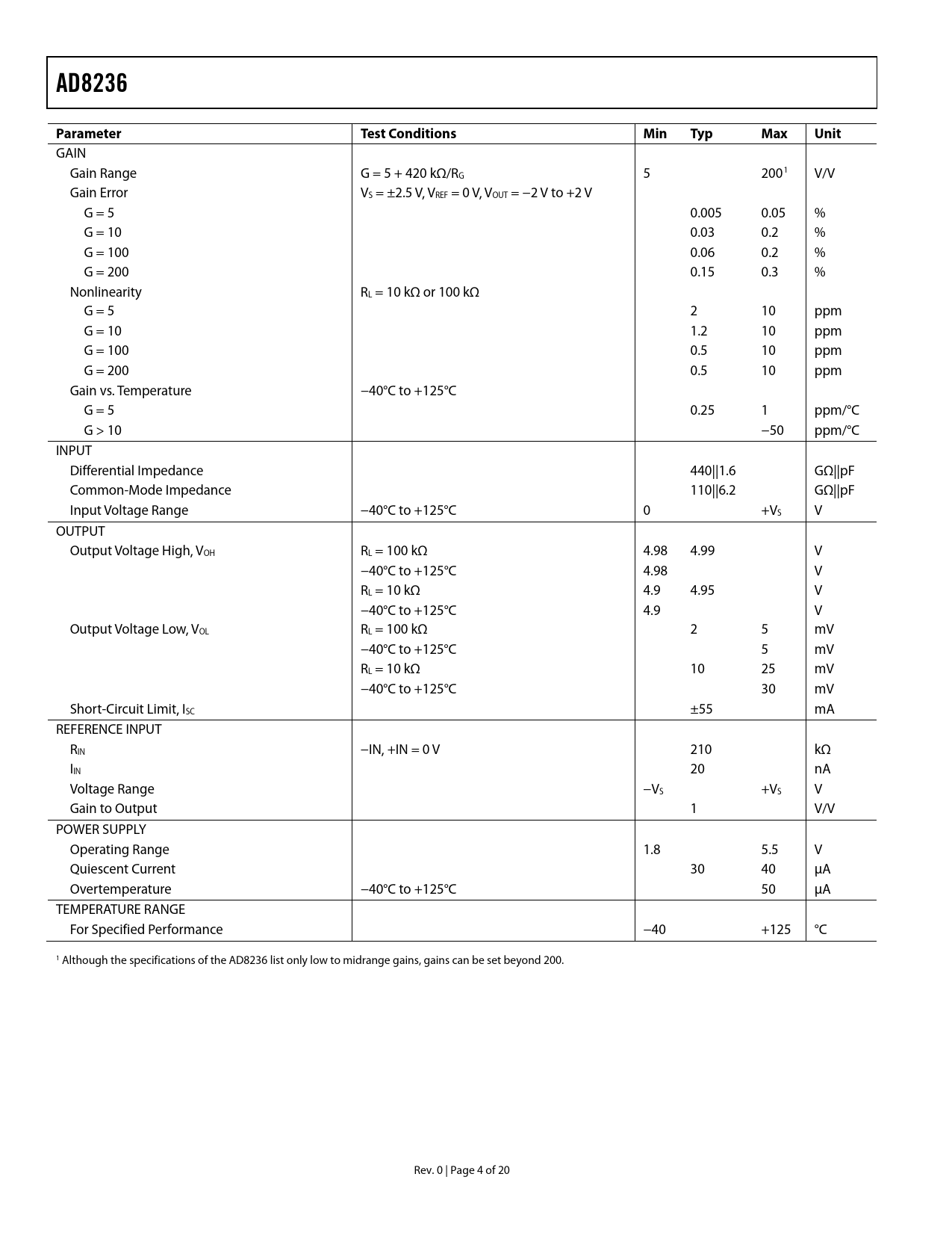 AD8236. Parameter Test. Conditions. Min. Typ. Max. Unit