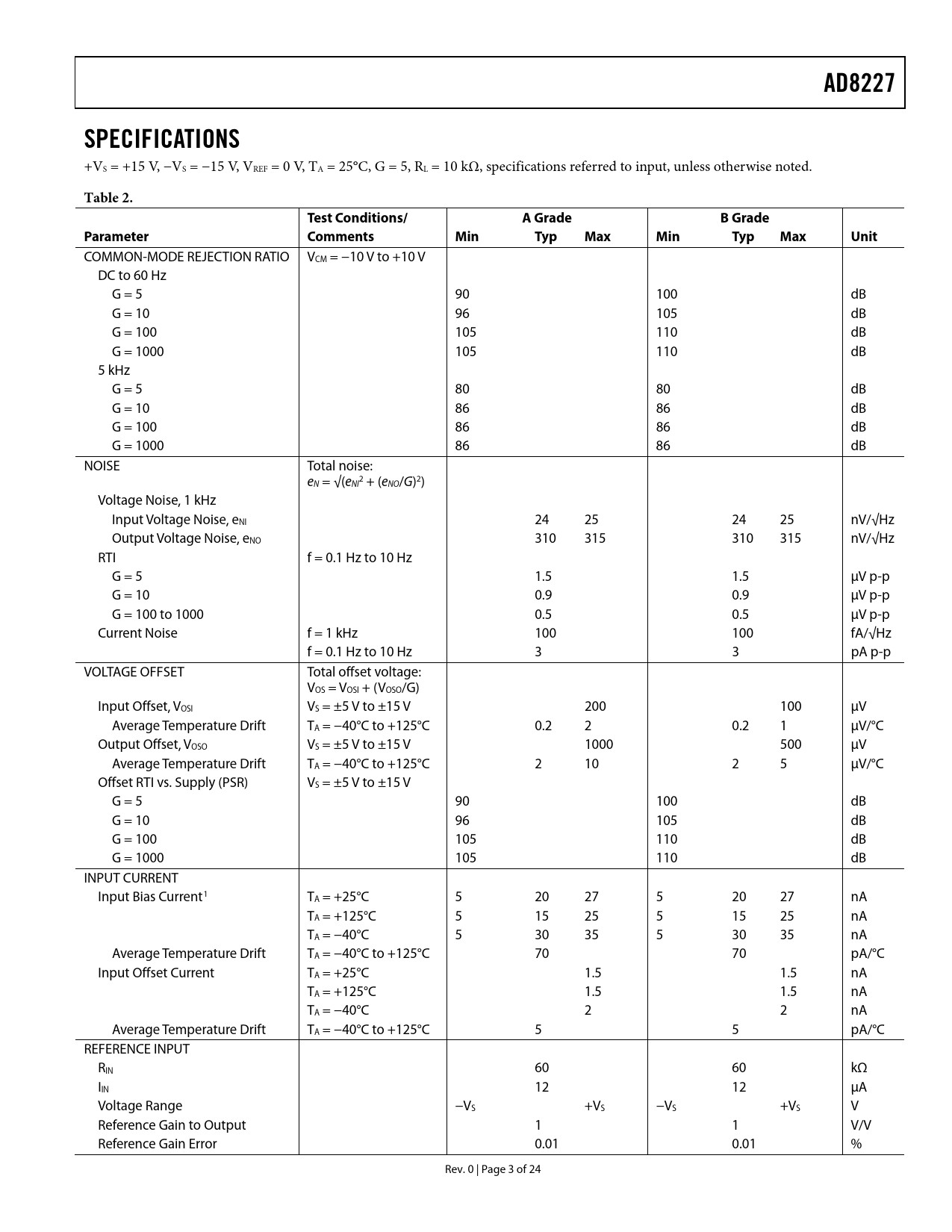 link to page 4 AD8227SPECIFICATIONS +VS = +15 V, −VS = −15 V, VREF = 0 V, TA = 25°C, G = 5, RL = 10 kΩ, specifications referred to input, unless otherwise noted. Table 2.Test Conditions/A GradeB GradeParameter CommentsMinTypMaxMinTypMaxUnit COMMON-MODE REJECTION RATIO VCM = −10 V to +10 V DC to 60 Hz G = 5 90 100 dB G = 10 96 105 dB G = 100 105 110 dB G = 1000 105 110 dB 5 kHz G = 5 80 80 dB G = 10 86 86 dB G = 100 86 86 dB G = 1000 86 86 dB NOISE Total noise: e 2 N = √(eNI + (eNO/G)2) Voltage Noise, 1 kHz Input Voltage Noise, eNI 24 25 24 25 nV/√Hz Output Voltage Noise, eNO 310 315 310 315 nV/√Hz RTI f = 0.1 Hz to 10 Hz G = 5 1.5 1.5 μV p-p G = 10 0.9 0.9 μV p-p G = 100 to 1000 0.5 0.5 μV p-p Current Noise f = 1 kHz 100 100 fA/√Hz f = 0.1 Hz to 10 Hz 3 3 pA p-p VOLTAGE OFFSET Total offset voltage: VOS = VOSI + (VOSO/G) Input Offset, VOSI VS = ±5 V to ±15 V 200 100 μV Average Temperature Drift TA = −40°C to +125°C 0.2 2 0.2 1 μV/°C Output Offset, VOSO VS = ±5 V to ±15 V 1000 500 μV Average Temperature Drift TA = −40°C to +125°C 2 10 2 5 μV/°C Offset RTI vs. Supply (PSR) VS = ±5 V to ±15 V G = 5 90 100 dB G = 10 96 105 dB G = 100 105 110 dB G = 1000 105 110 dB INPUT CURRENT Input Bias Current1 TA = +25°C 5 20 27 5 20 27 nA TA = +125°C 5 15 25 5 15 25 nA TA = −40°C 5 30 35 5 30 35 nA Average Temperature Drift TA = −40°C to +125°C 70 70 pA/°C Input Offset Current TA = +25°C 1.5 1.5 nA TA = +125°C 1.5 1.5 nA TA = −40°C 2 2 nA Average Temperature Drift TA = −40°C to +125°C 5 5 pA/°C REFERENCE INPUT RIN 60 60 kΩ IIN 12 12 μA Voltage Range −VS +VS −VS +VS V Reference Gain to Output 1 1 V/V Reference Gain Error 0.01 0.01 % Rev. 0 | Page 3 of 24 Document Outline FEATURES APPLICATIONS PIN CONFIGURATION GENERAL DESCRIPTION TABLE OF CONTENTS REVISION HISTORY SPECIFICATIONS ABSOLUTE MAXIMUM RATINGS THERMAL RESISTANCE ESD CAUTION PIN CONFIGURATION AND FUNCTION DESCRIPTIONS TYPICAL PERFORMANCE CHARACTERISTICS THEORY OF OPERATION ARCHITECTURE GAIN SELECTION REFERENCE TERMINAL INPUT VOLTAGE RANGE LAYOUT Common-Mode Rejection Ratio over Frequency Power Supplies References INPUT BIAS CURRENT RETURN PATH INPUT PROTECTION RADIO FREQUENCY INTERFERENCE (RFI) APPLICATIONS INFORMATION DIFFERENTIAL DRIVE Tips for Best Differential Output Performance PRECISION STRAIN GAGE DRIVING AN ADC OUTLINE DIMENSIONS ORDERING GUIDE